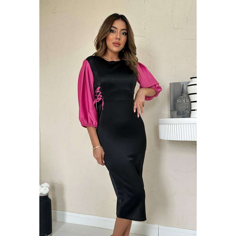 ชุดเดรสผ้าซาตินขายส่ง พร้อมดีเทลผูกเชือกสีดำและสีบานเย็น เอวทรงธรรมชาติ