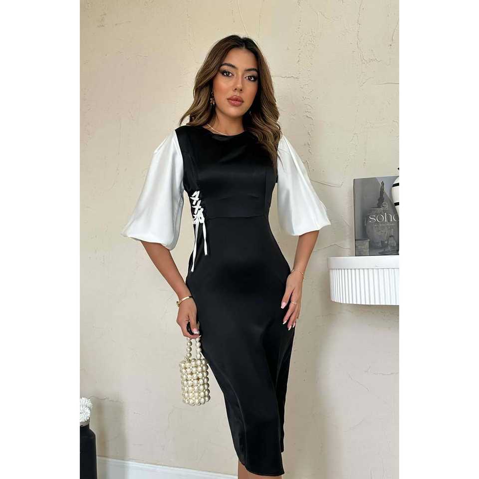 ชุดราตรีผ้าซาตินขายส่ง พร้อมดีเทลผูกเชือกสีดำและสีขาว