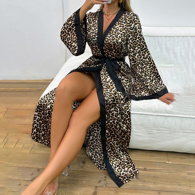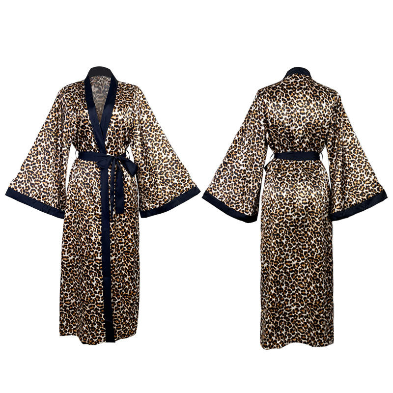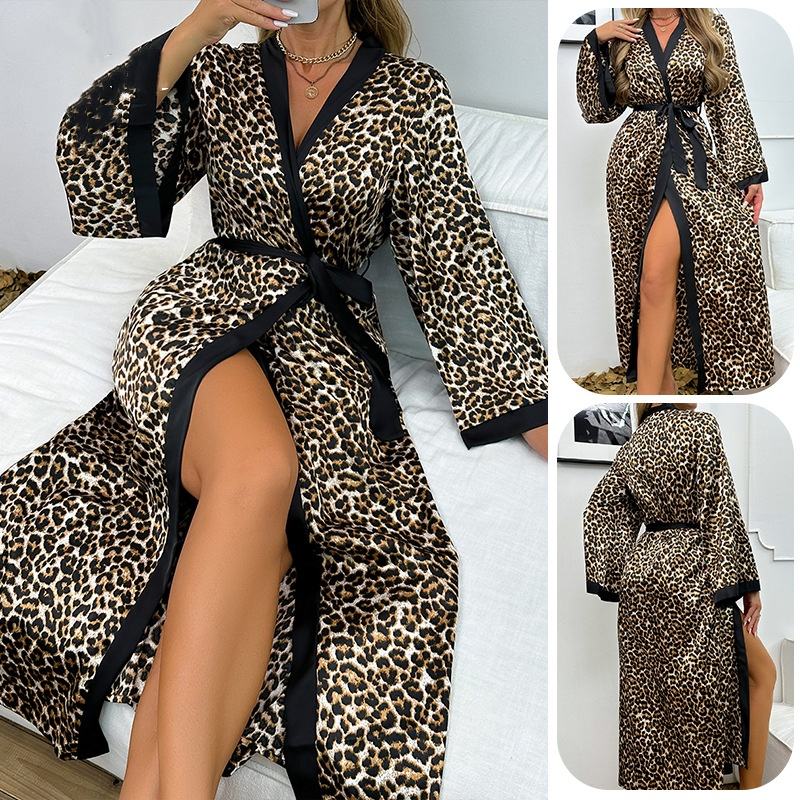 ชุดคลุมยาวลายเสือดาวผ้าซาตินขายส่งสำหรับผู้หญิง ชุดนอนแขนยาวคอวีเซ็กซี่