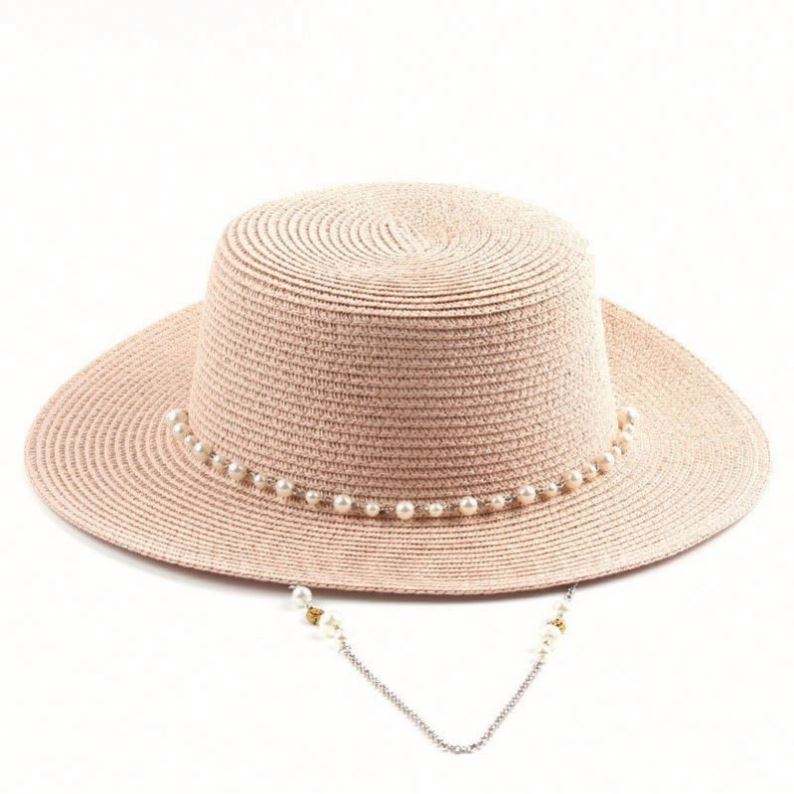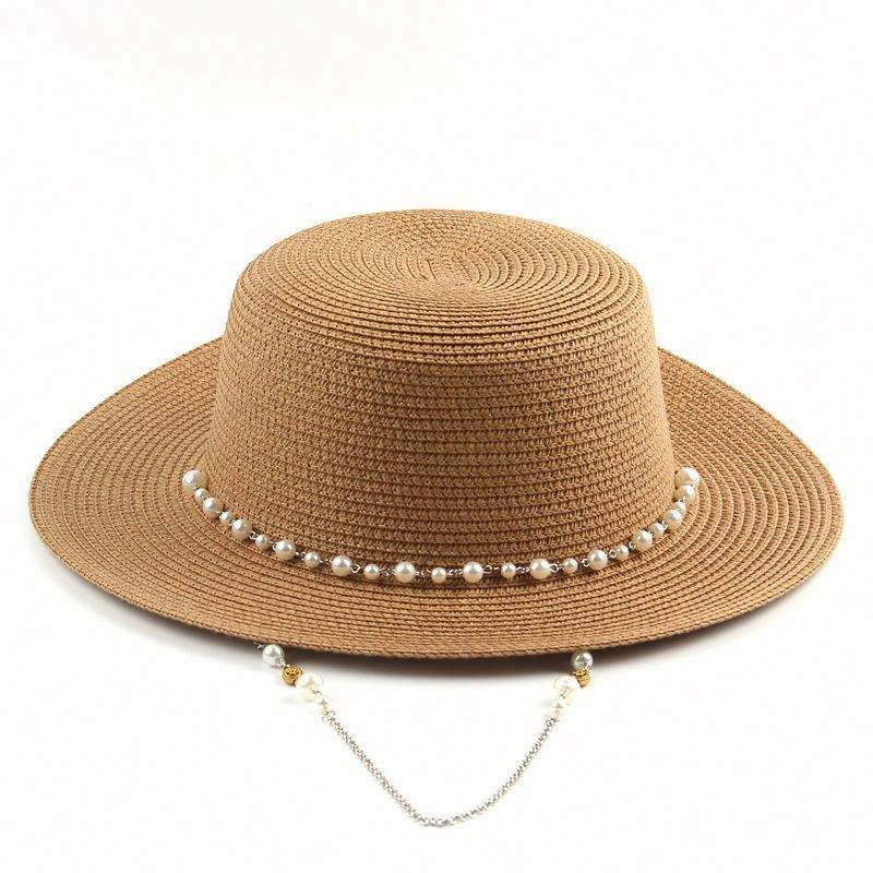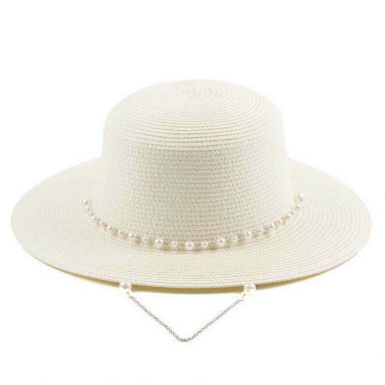 หมวกสานปีกกว้างทรงกลมสำหรับผู้หญิง ประดับด้วยสายไข่มุก เหมาะสำหรับชายหาด ขายส่ง