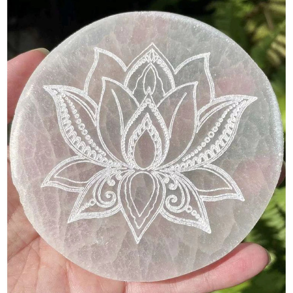 แผ่นชาร์จพลังงานเซเลไนต์แบบขายส่ง พร้อมลวดลายดอกบัวแกะสลักด้วยคริสตัลธรรมชาติ