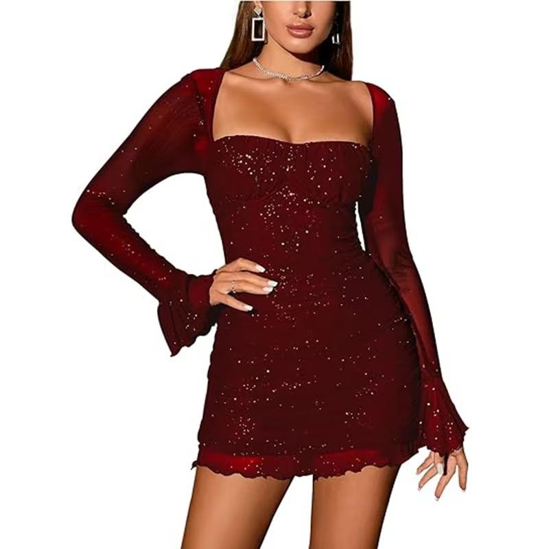 มินิเดรสรัดรูปแขนยาวผ้าตาข่ายสีดำระยิบระยับสำหรับผู้หญิงใส่ไปคลับปาร์ตี้กลางคืน