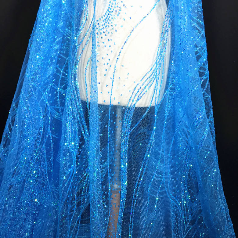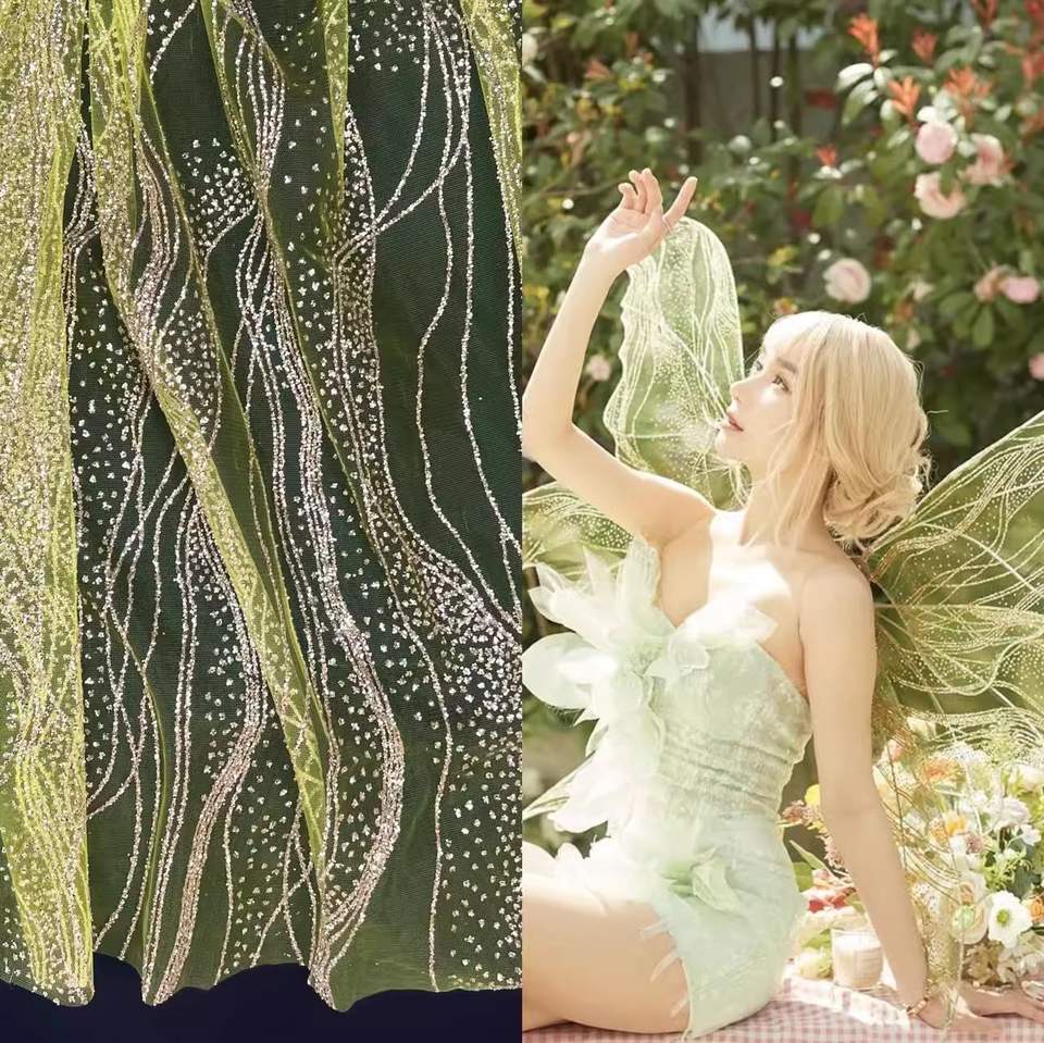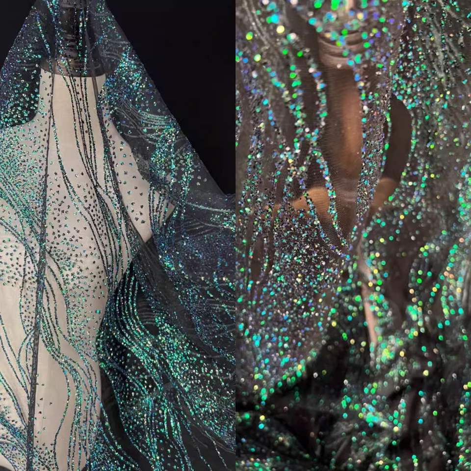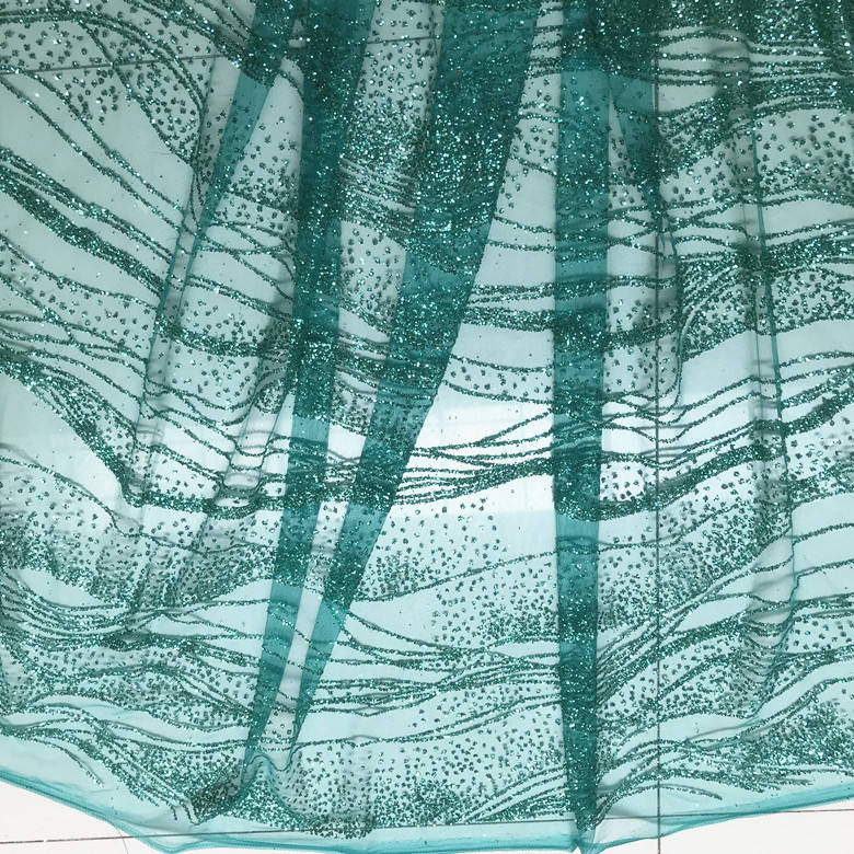 Wholesale Shining Silver Powder Spraying Glued Glitter Green Water Wave Foil Glitter Lace Mesh Tulle Fabrics for Women Dress