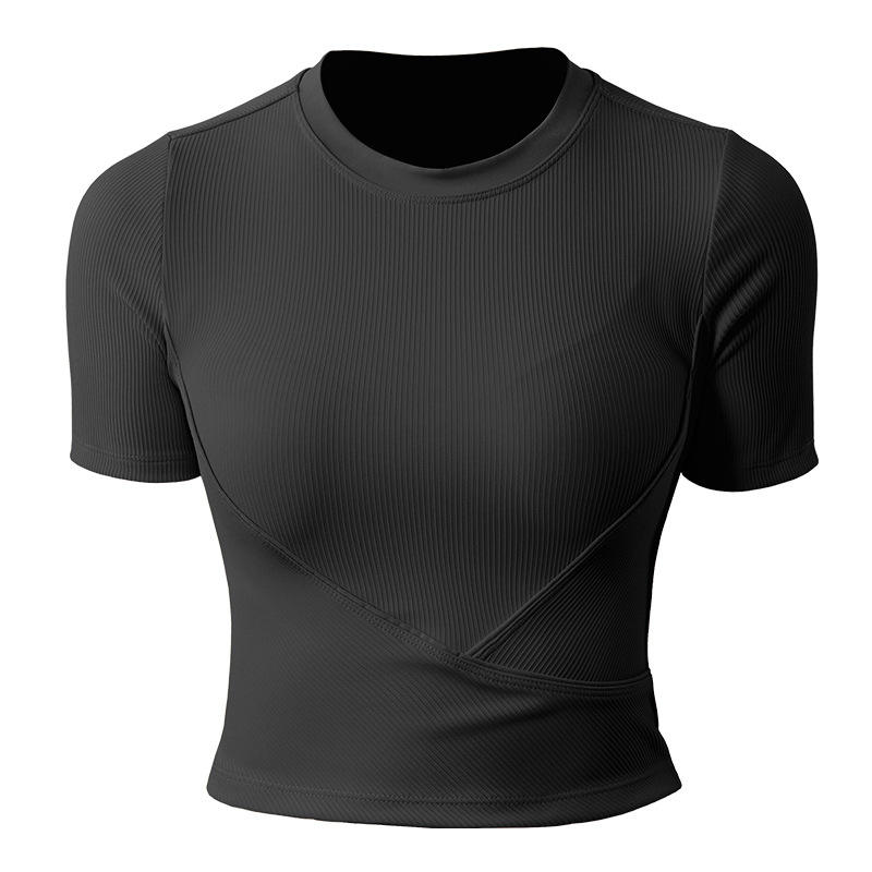เสื้อกล้ามออกกำลังกายโยคะแขนสั้นแบบสบายๆ ขายส่ง แห้งเร็ว ระบายอากาศดี มีโลโก้ด้านหน้า ทรงปกติสำหรับผู้หญิง เหมาะสำหรับใส่ในยิม