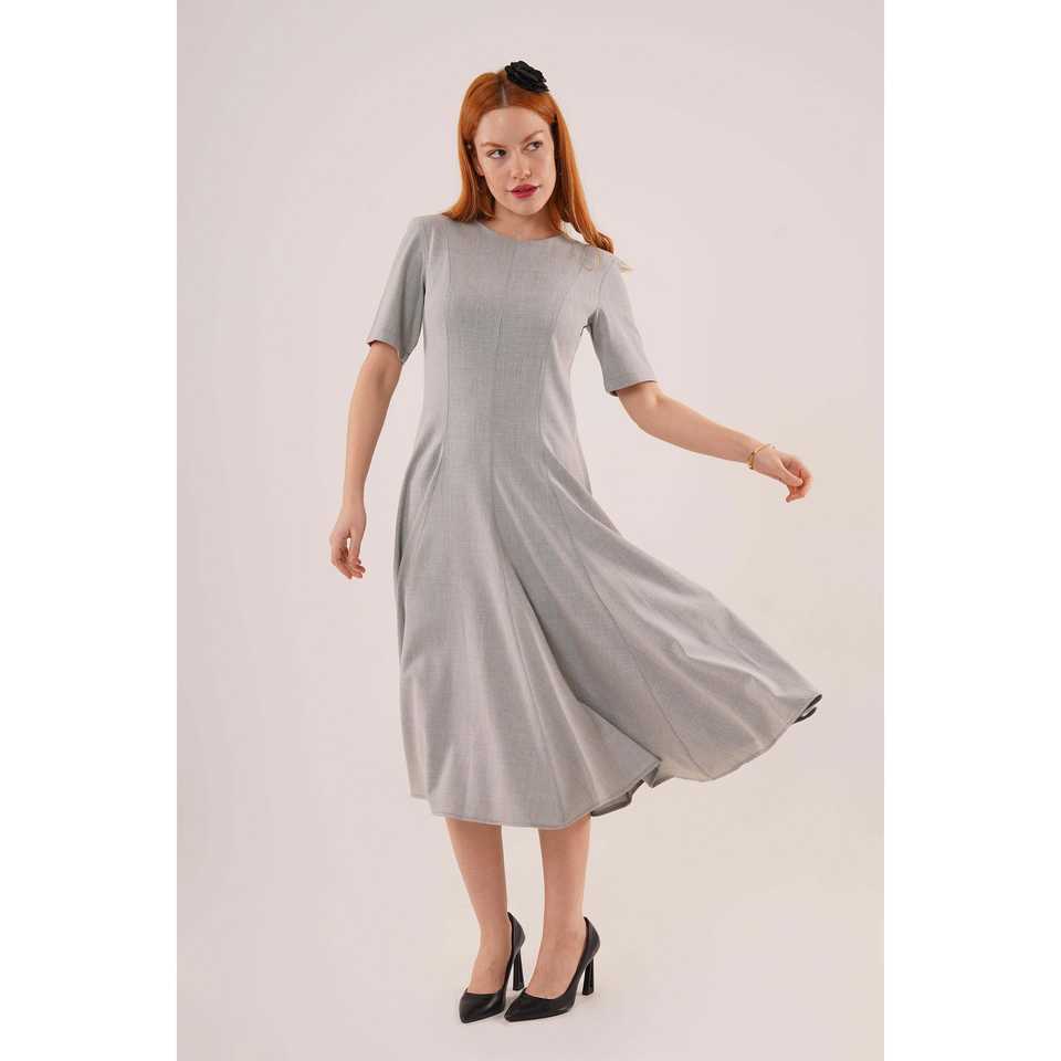 เดรสยาวสีเทาแขนสั้นขายส่ง พร้อมดีเทลการเย็บที่มีสไตล์ เหมาะสำหรับใส่ทำงาน