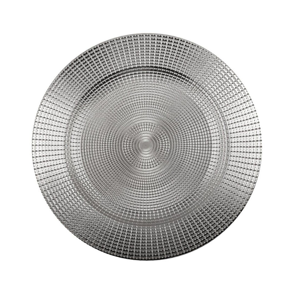 จานรองอาหารโลหะสีเงินขายส่ง ลายรัศมีแสงอาทิตย์ พร้อมขอบลายนูนสไตล์บาโรก สำหรับตกแต่งโต๊ะงานแต่งงานและงานอีเว้นท์ ราคาดี