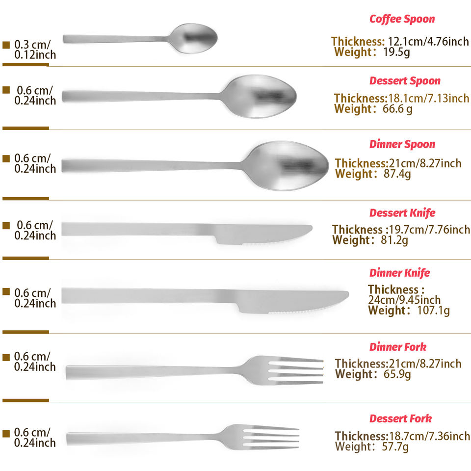 1 ชุดประกอบด้วย:มีดรับประทานอาหาร 1 เล่ม, ช้อนรับประทานอาหาร 1 คัน, ส้อมรับประทานอาหาร 1 อัน, ช้อนชา 1 ช้อน, ส้อมสลัด 1 อัน