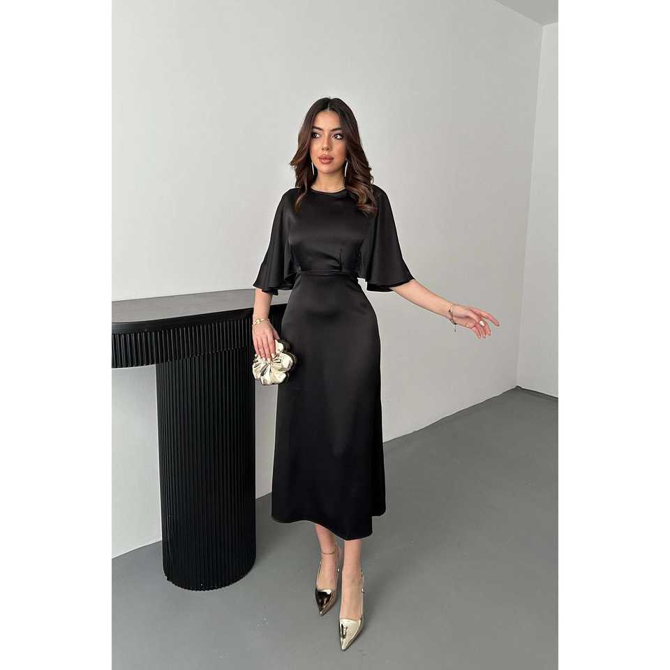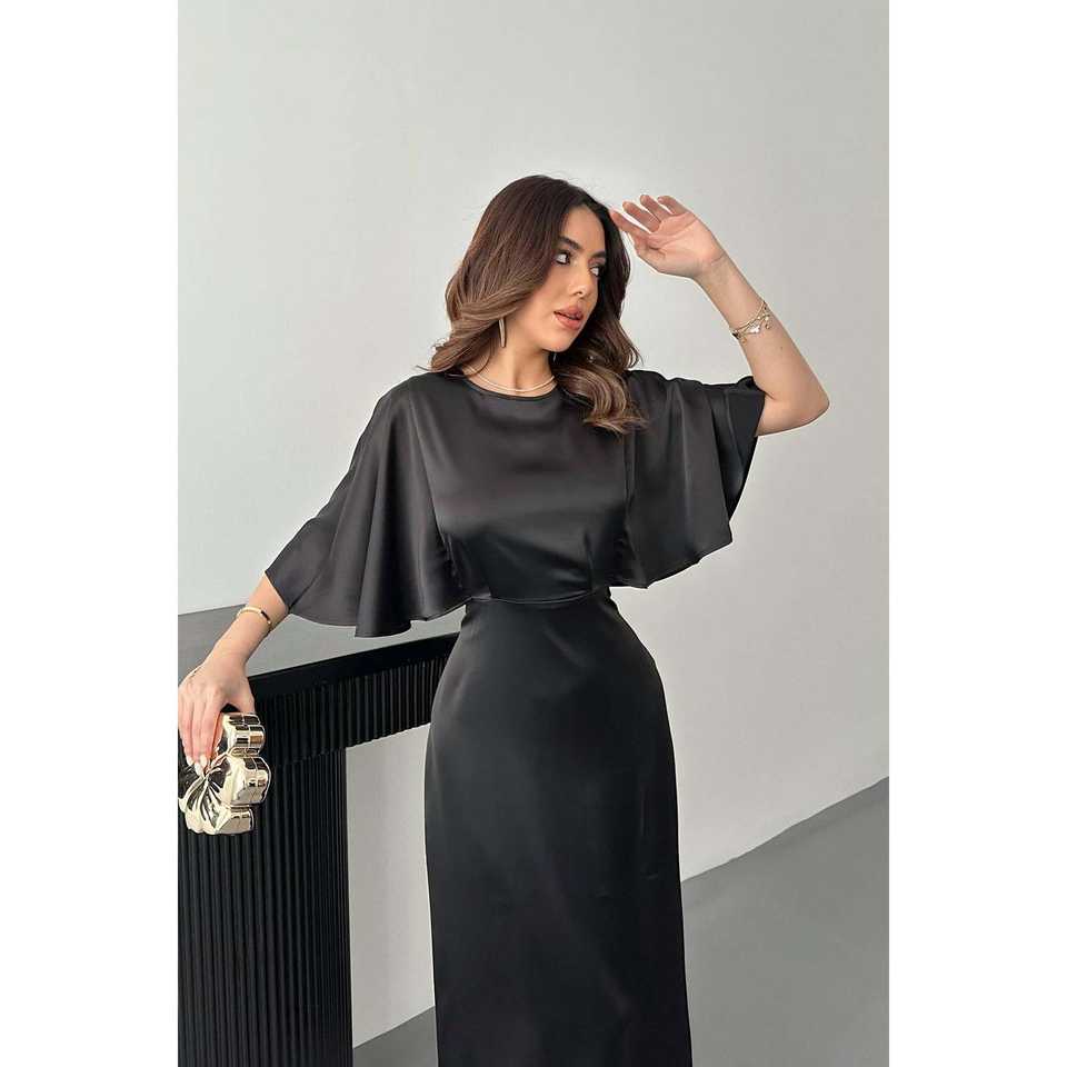 ชุดราตรีทรงบอลกาวน์สีดำเรียบง่ายแบบขายส่ง แต่งลูกไม้ผูกหลัง เอวทรงเอ็มไพร์ แขนสั้น ตกแต่งลายดอกไม้ตามสั่ง ความยาวระดับพื้น ทรงเอไลน์
