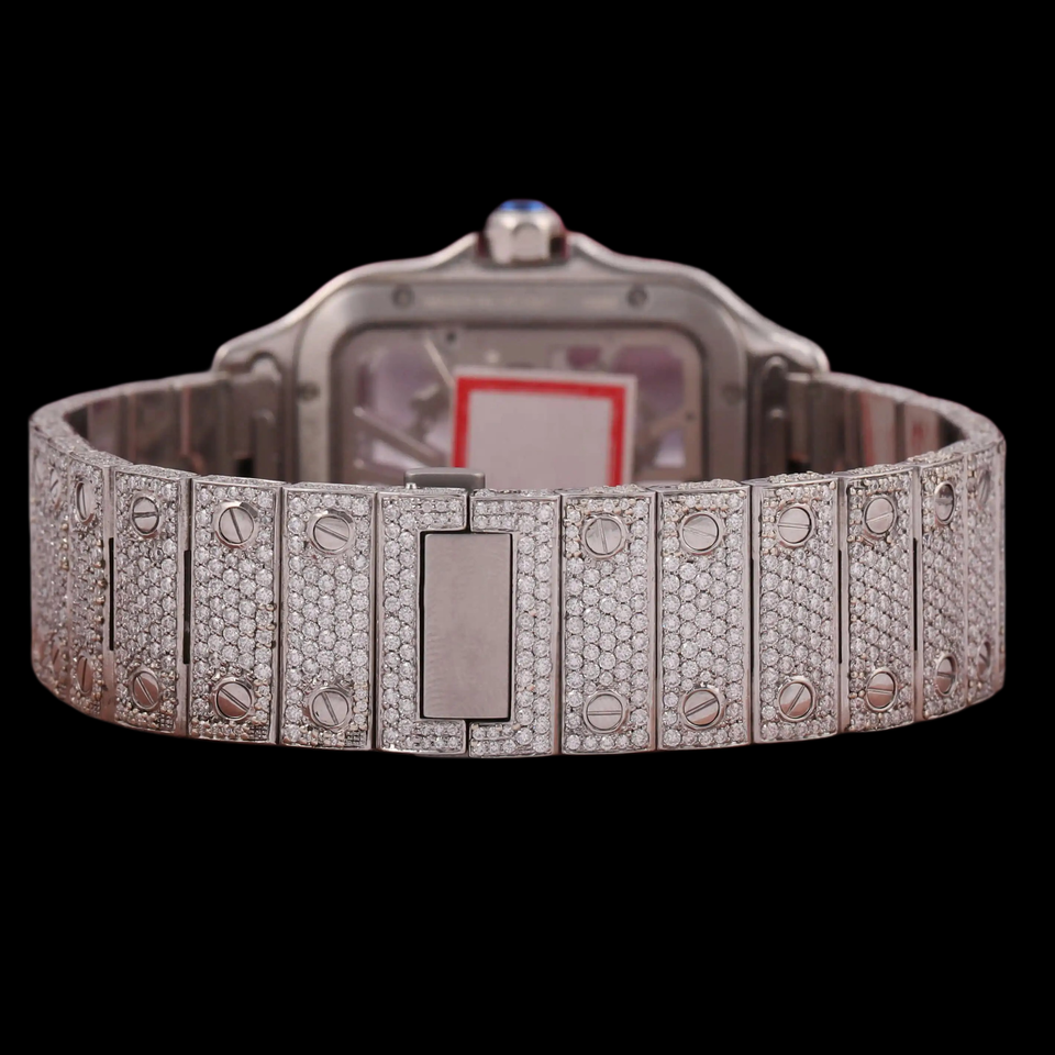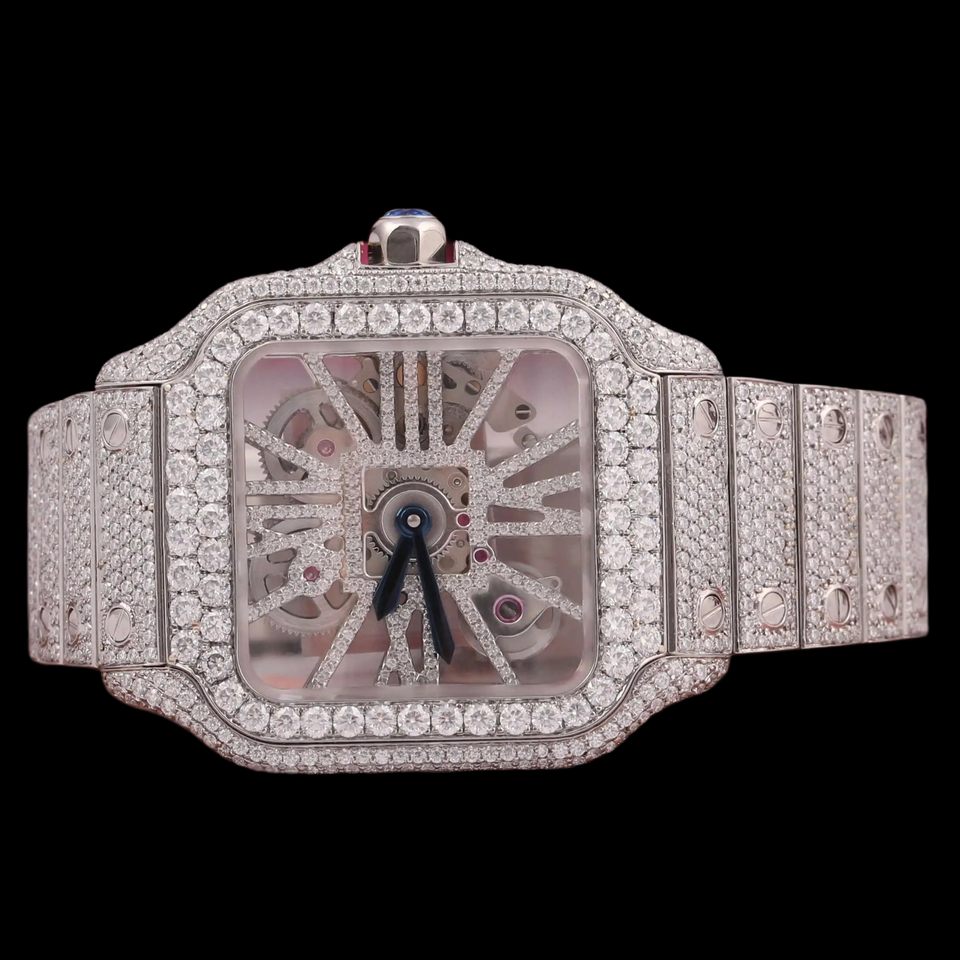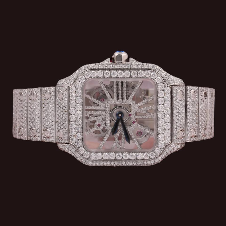 นาฬิกาโครโนกราฟผู้ชาย ดีไซน์หรูหรา หน้าปัดทรงสี่เหลี่ยมประดับเพชรโมอิสซาไนต์เต็มหน้าปัด ระยิบระยับ พร้อมกลไกควอตซ์