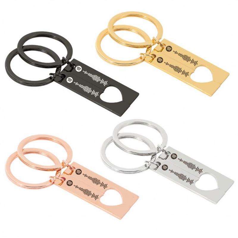 พวงกุญแจเพลงสแตนเลสพวงกุญแจโลหะสลักโลโก้ตามสั่งพวงกุญแจรูปหัวใจแบบเลเซอร์ของขวัญสแกนเพลง