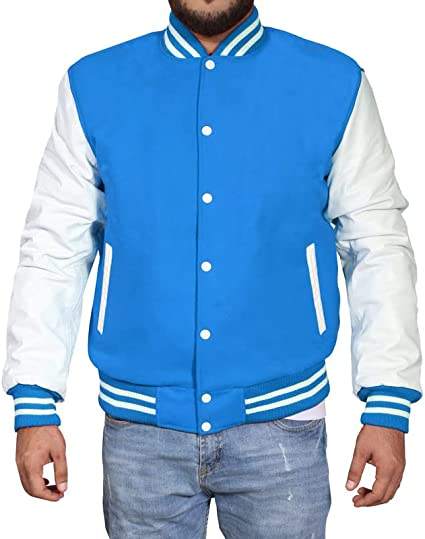 เสื้อแจ็คเก็ตเบสบอลคอปกหนังขนแกะสีฟ้าอ่อนสำหรับผู้ชายเสื้อแจ็คเก็ตเบสบอลทีมวิทยาลัย