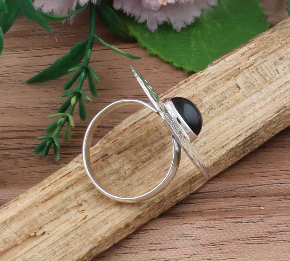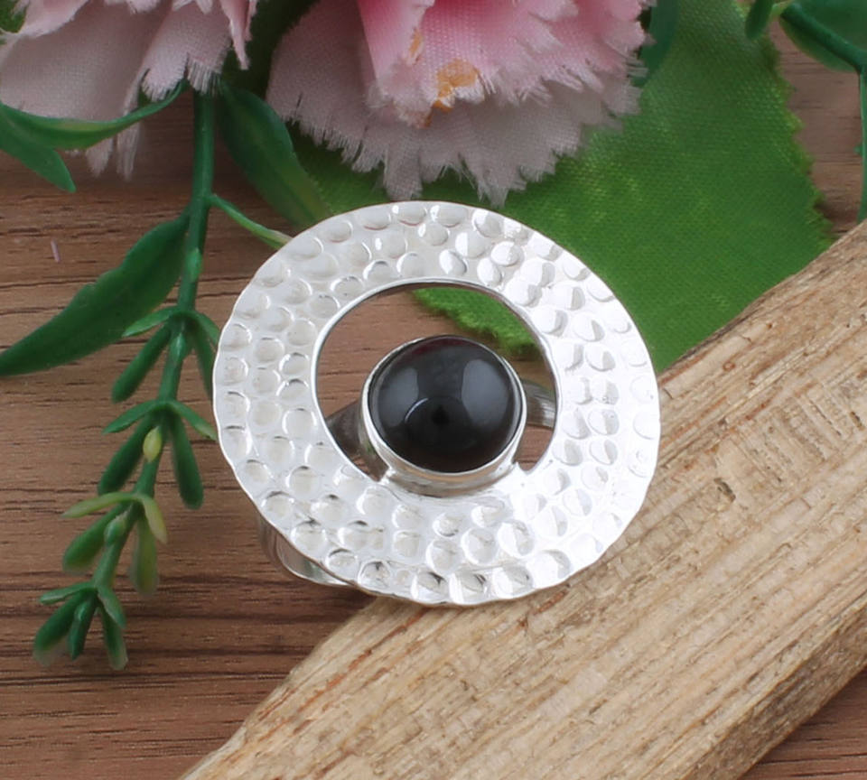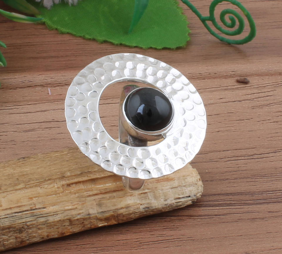 แหวนเงินแท้ประดับพลอยออนิกซ์ดำธรรมชาติทรงวินเทจแบบตอกลาย สำหรับผู้หญิง งานแฮนด์เมด เหมาะสำหรับงานแต่งงานและงานปาร์ตี้