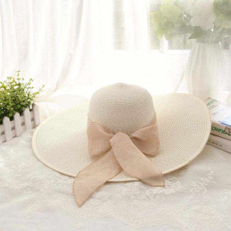 หมวกสานปีกกว้างสำหรับผู้หญิง ป้องกันแสงแดด ใส่เที่ยวทะเล พับเก็บได้