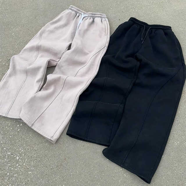 กางเกงสตรีทแฟชั่นขายส่ง แต่งผ้าต่อลายตัดกัน เอวยางยืด ผ้าฝ้าย 100% ทรงหลวม ขาตรง ล้างสีแบบ Acid Wash สำหรับผู้ชาย