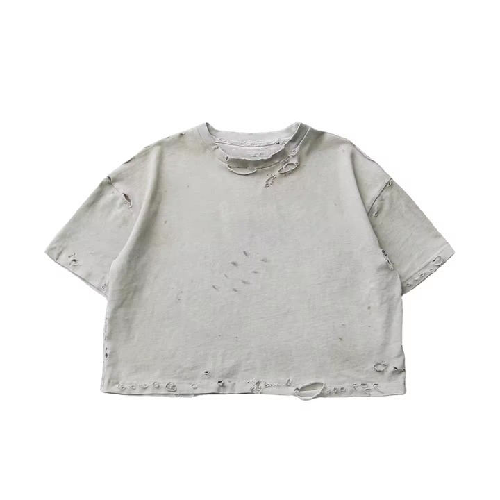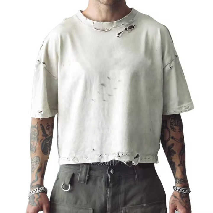 เสื้อยืดสตรีทแวร์สไตล์วินเทจ ล้างสี ทรงใหญ่ ตัดสั้น โอเวอร์ไซส์ ขาดๆ สำหรับผู้ชาย ขายส่ง
