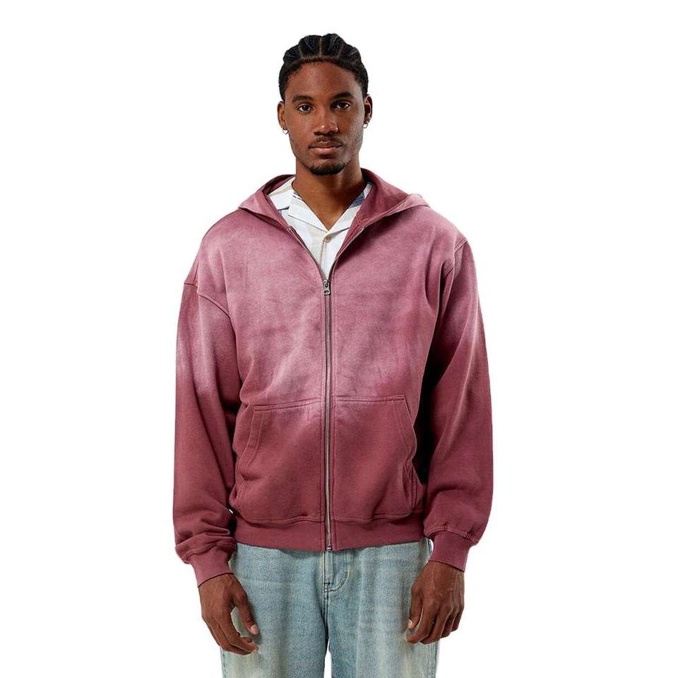 เสื้อฮู้ดซิปสตรีทแวร์ขายส่ง ผ้าเทอร์รี่คอตตอน ล้างสีแบบแอซิด ตกแต่งคริสตัลแบบกำหนดเอง ซิปเต็มตัว ป้องกันแสงแดด สำหรับผู้ชาย