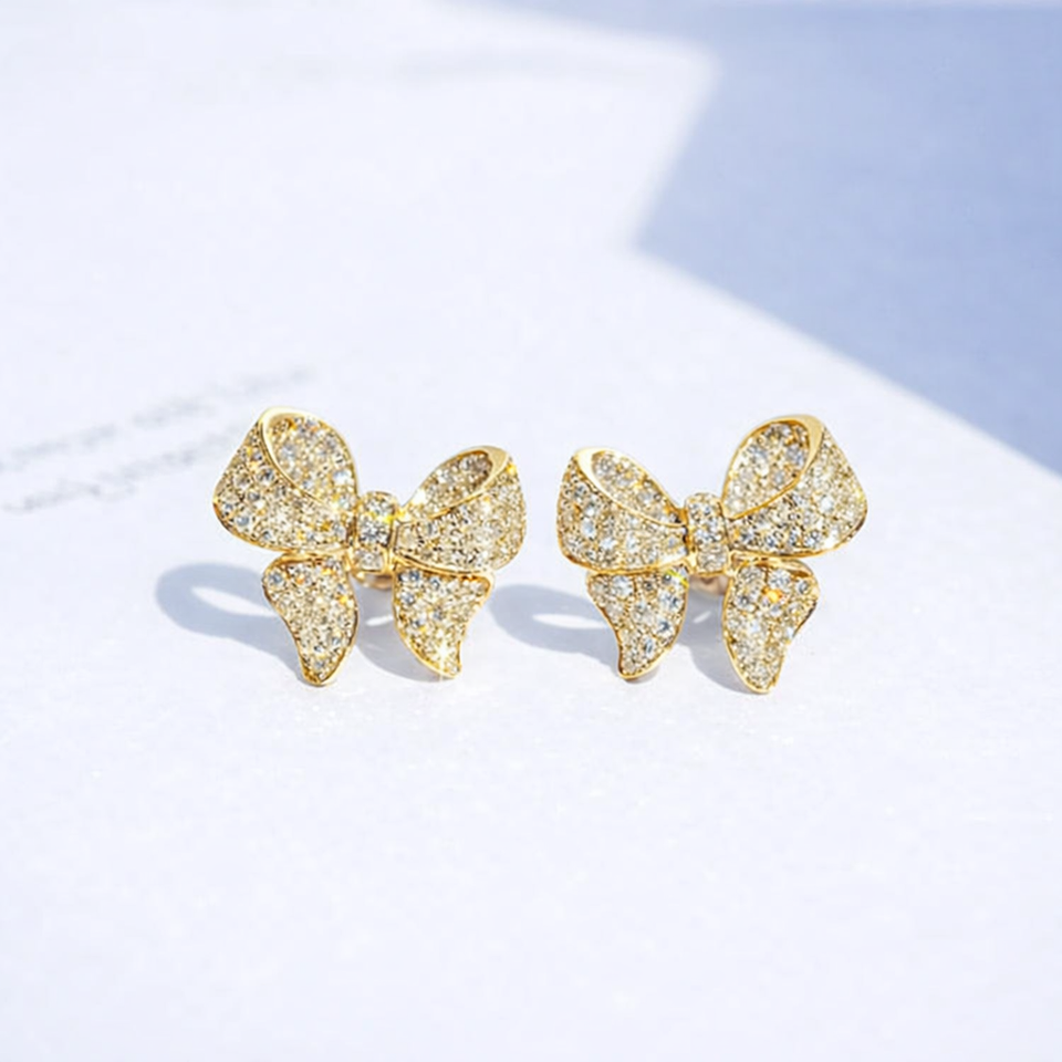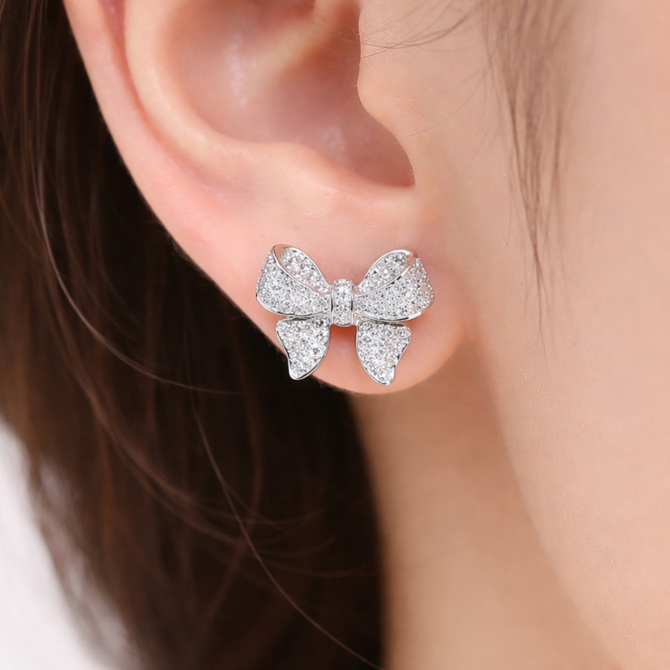 ต่างหูเพชรทรงโบว์แบบขายส่ง ต่างหูเพชรทรงโบว์น่ารัก ทองคำขาว 14K ประดับเพชรแบบ Pave สำหรับผู้หญิง เครื่องประดับหรูหรา