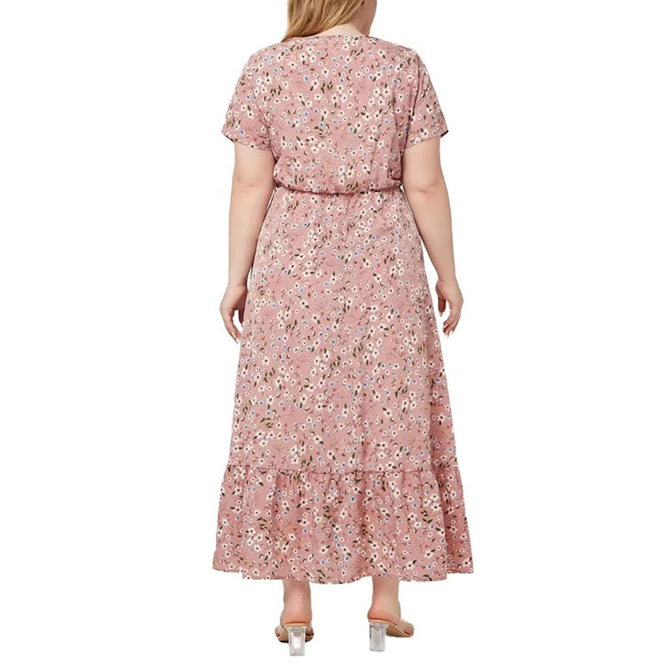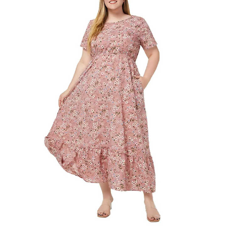 เดรสลำลองชายหาดฤดูร้อนแบบขายส่ง คอกลม แขนสั้น ไซส์ใหญ่ ทรงเอ็มไพร์ พิมพ์ลายดอกไม้