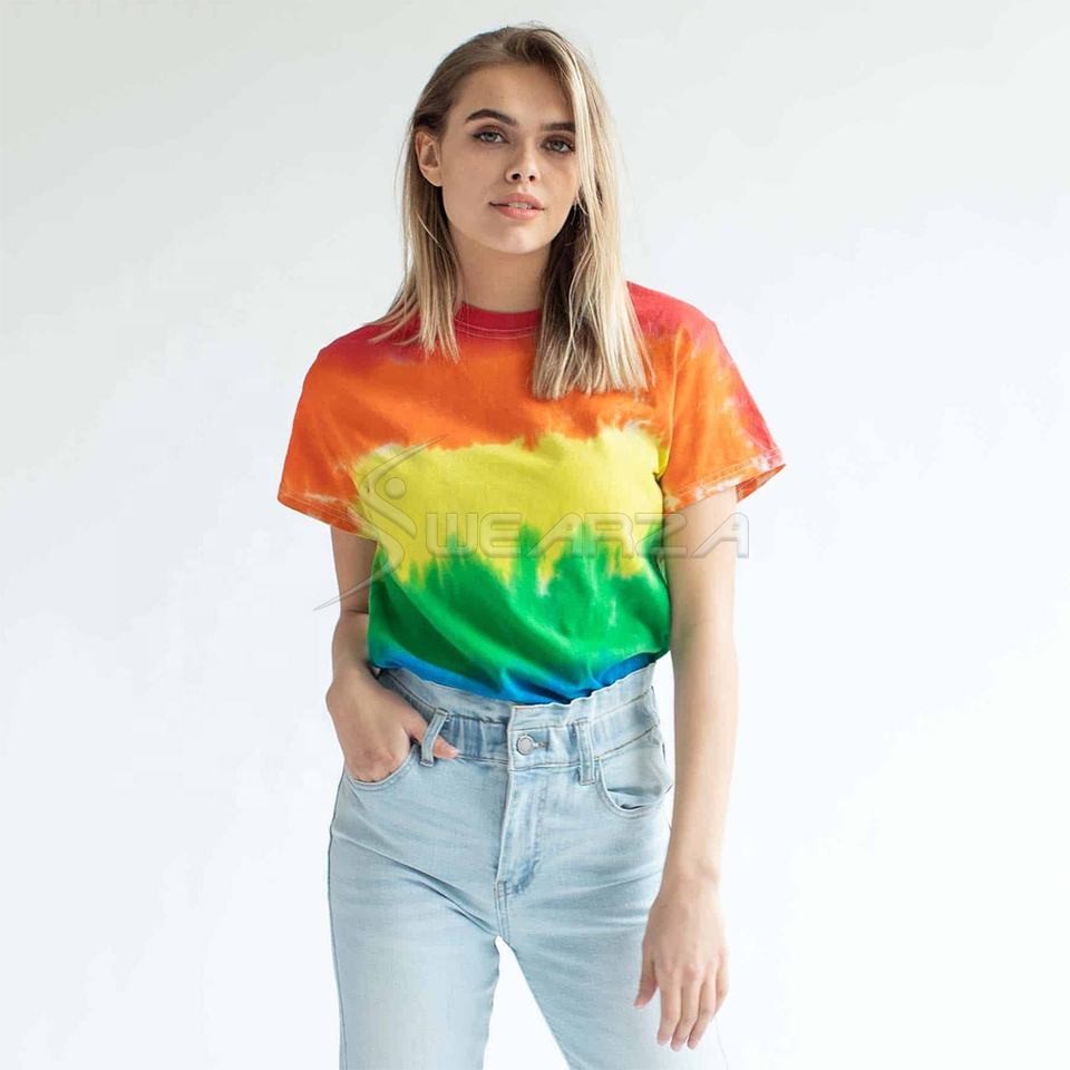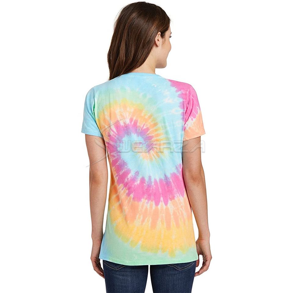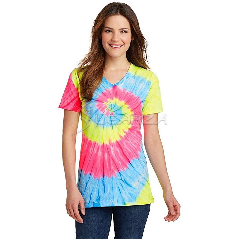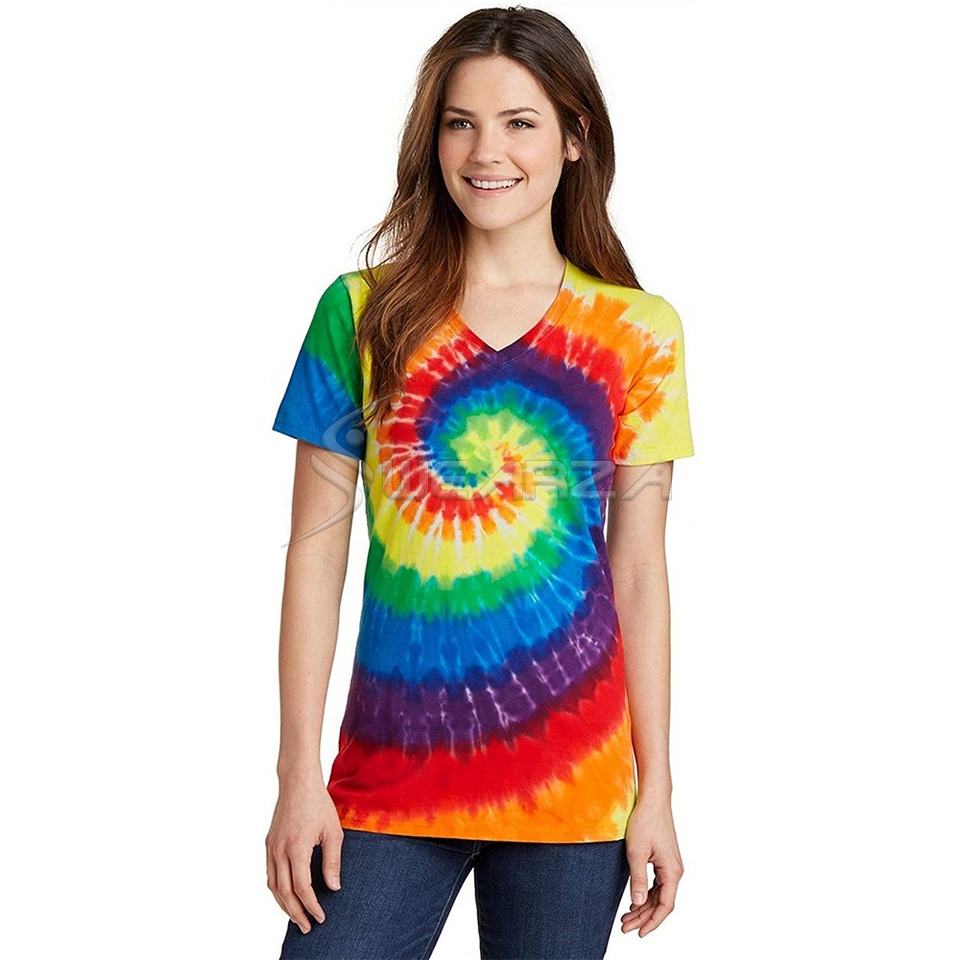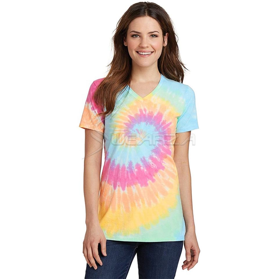 ขายส่งฤดูร้อนสบายแขนสั้นสดใสTie Dyeเสื้อผู้หญิงเทศกาลรูปแบบที่กําหนดเองTie Dye Vคอเสื้อ