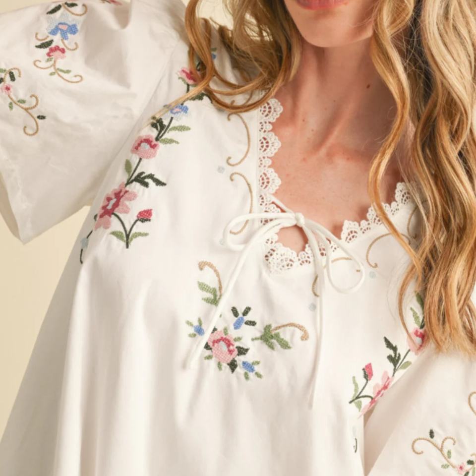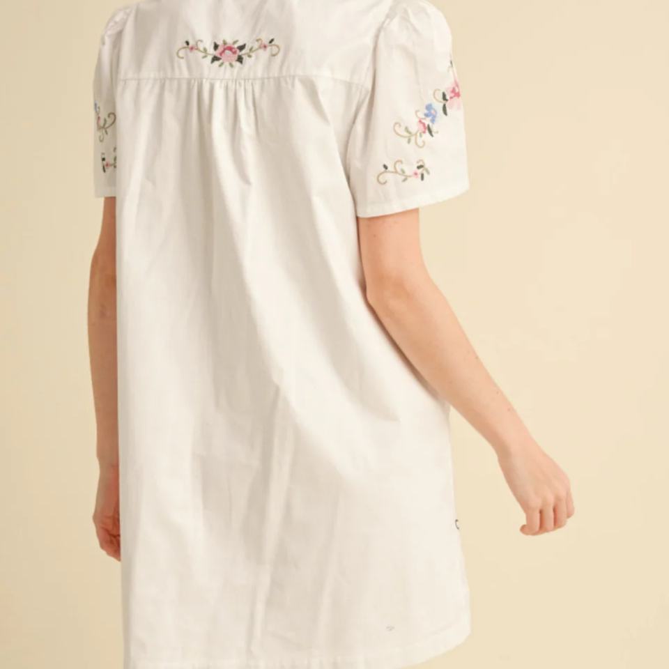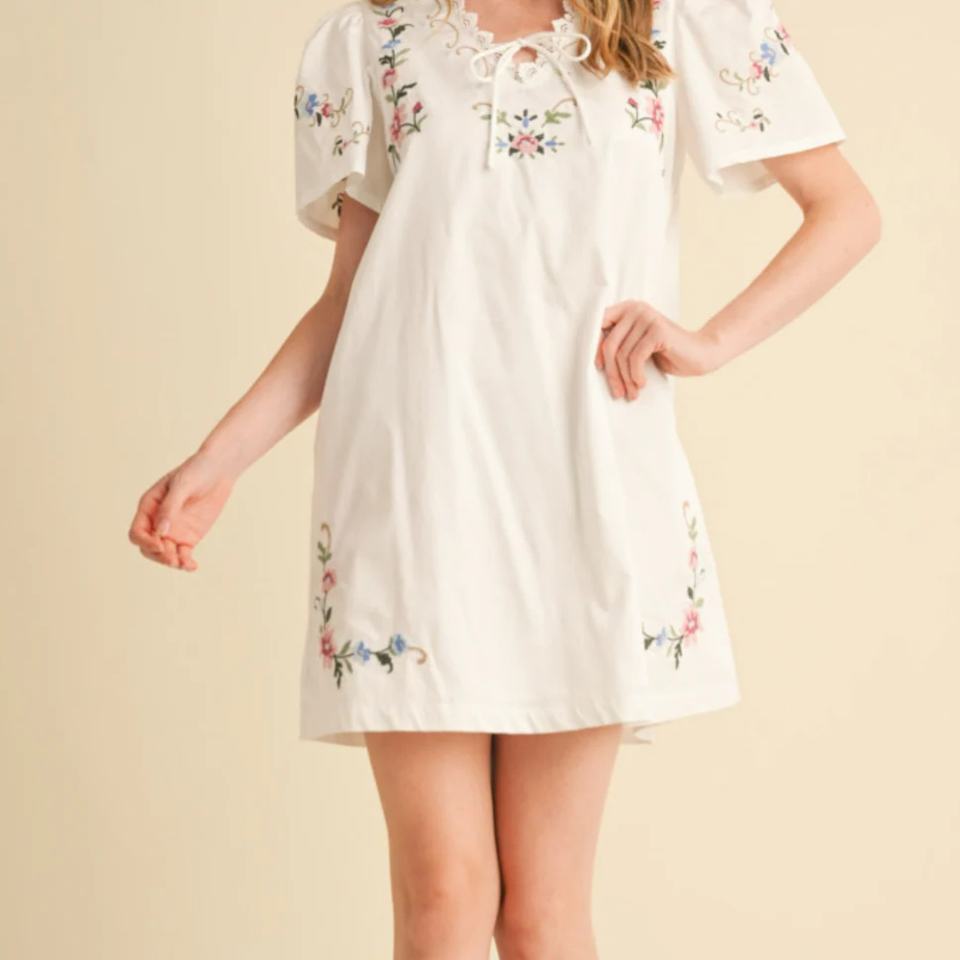 เดรสฤดูร้อนขายส่งสำหรับผู้หญิง เดรสลำลองทรงหลวมแบบเรียบร้อย คอวี แต่งลูกไม้ ปักลายดอกไม้ เดรสสั้น