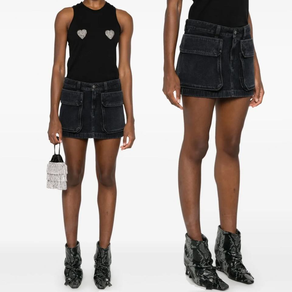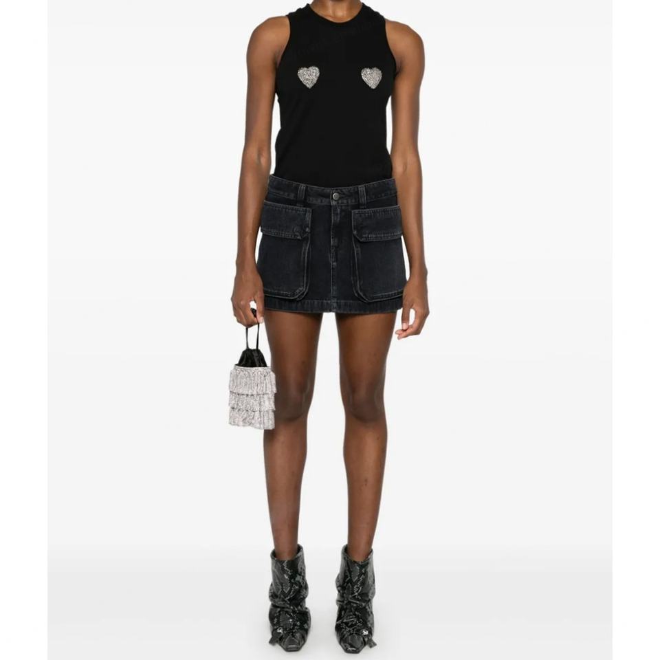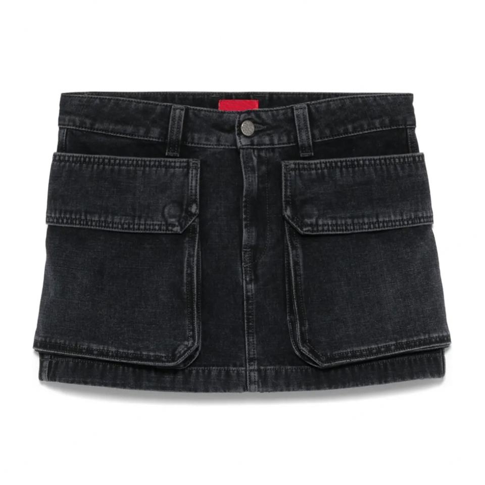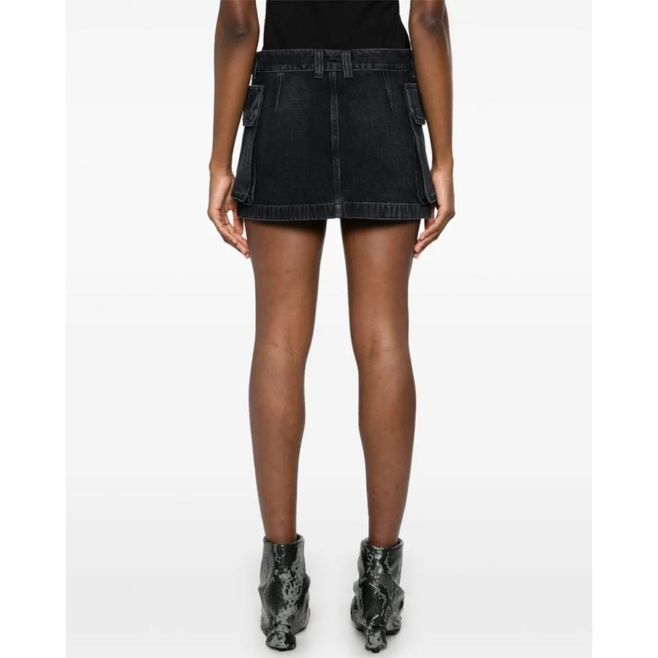 กระโปรงยีนส์สั้นสีดำแฟชั่นฤดูร้อนขายส่งสำหรับผู้หญิง กระโปรงยีนส์มีกระเป๋าคาร์โก้