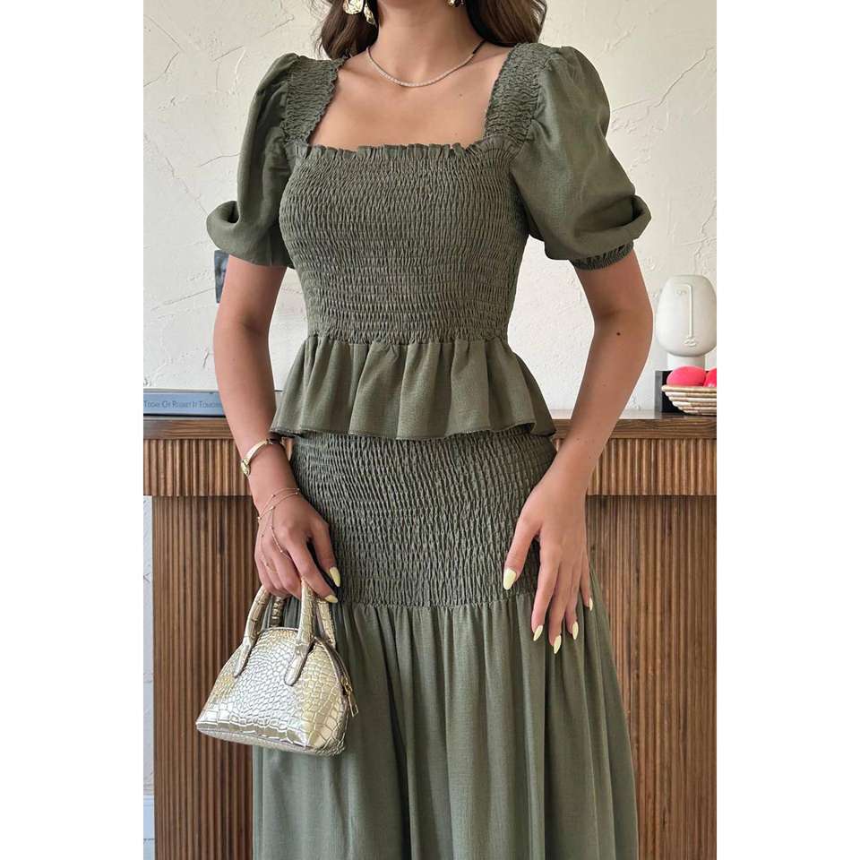 ชุดผ้าลินินกีเพลีสีกากีสำหรับฤดูร้อน ขายส่ง ไซส์ XS/XS เสื้อครอปสั้นและกางเกงขาสั้นเหนือเข่า ดีไซน์เรียบง่าย ผ้าทอถัก
