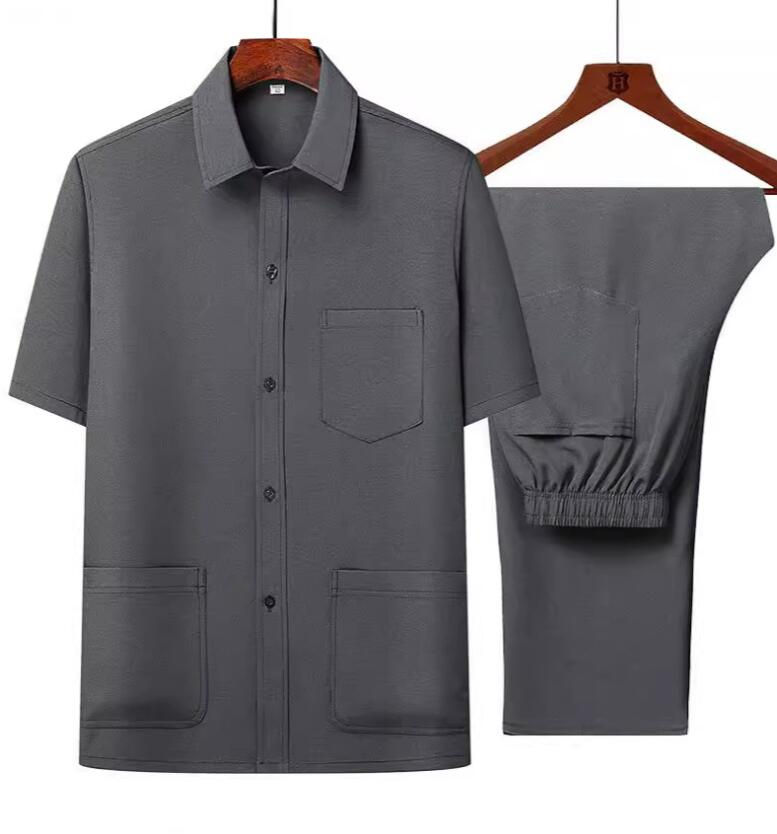 เสื้อเชิ้ตแขนสั้นสำหรับผู้ชายและวัยกลางคนชุดเสื้อผ้า2ชิ้นผ้าไอซ์ซิลค์พร้อมกางเกงสำหรับฤดูร้อน