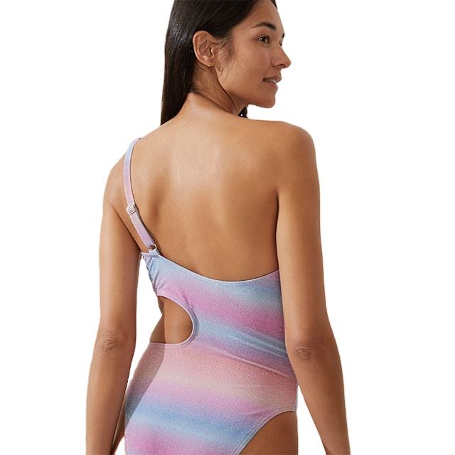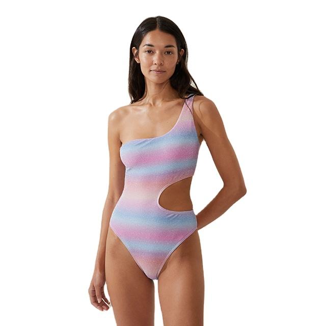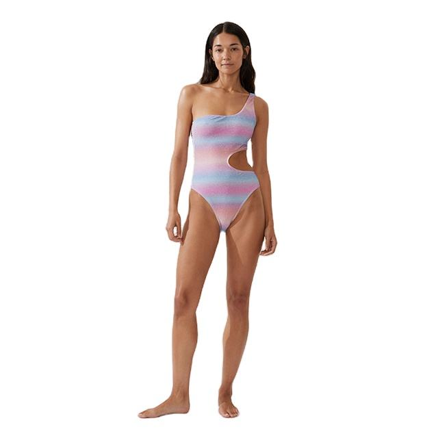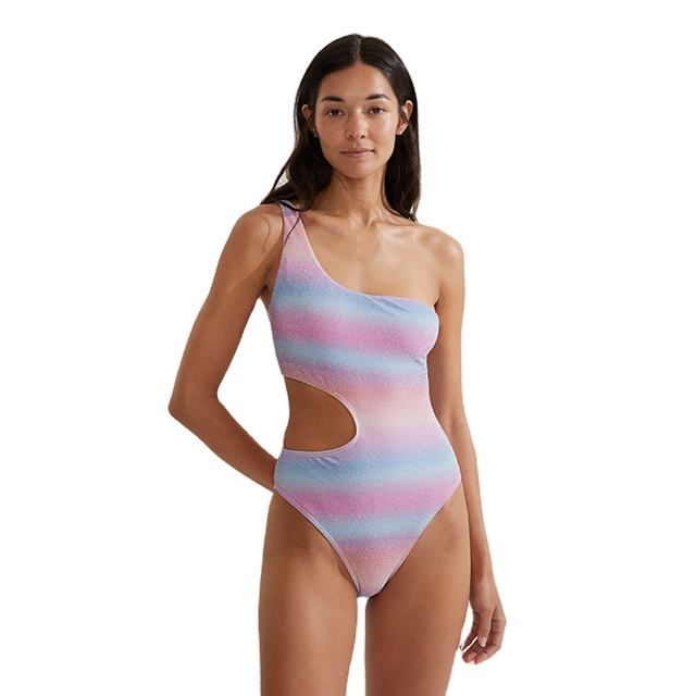 ชุดว่ายน้ำผู้หญิงแบบขายส่ง เซ็กซี่ ใส่ได้ทุกฤดู ไหล่เดียว คอวี กระชับสัดส่วน พิมพ์ลายด้วยความร้อน ทรงเข้ารูป