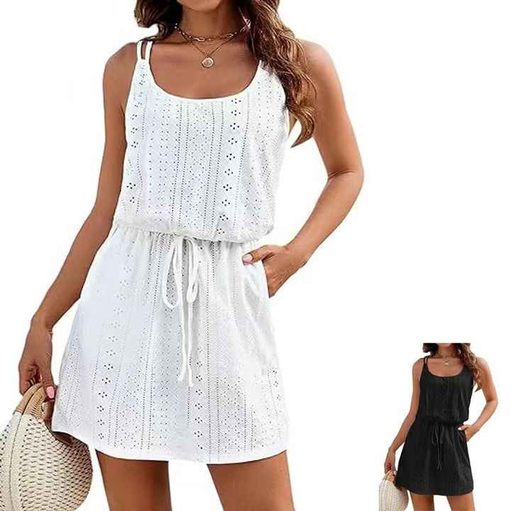 เดรสแขนกุดผ้าเนื้อนุ่มระบายอากาศดี สีพื้น คอทรงโอ แต่งรูระบายอากาศ เอวธรรมชาติ ความยาวปานกลาง สไตล์ลำลองสำหรับผู้หญิง ขายส่งสำหรับฤดูร้อน