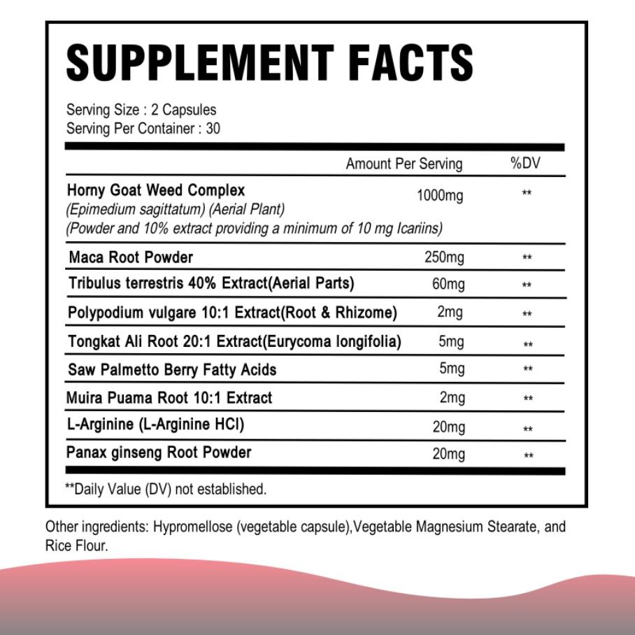 ส่วนผสมหลัก:สารสกัดจากหญ้าแพะเร้าอารมณ์, สารสกัดจากรากมาคา, สารสกัดจากตองกัตอิล, สารสกัดจากหญ้าแพะเร้าอารมณ์, สารสกัดจากรากมาคา, สารสกัดจากตองกัตอิล