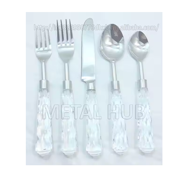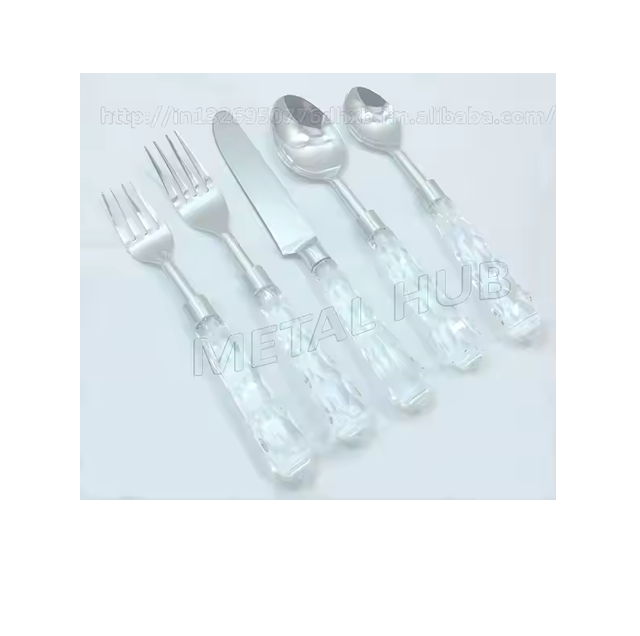 ชุดเครื่องใช้บนโต๊ะอาหารตกแต่งแบบหรูหราหรูหราพร้อมผิวขัดเงาสีเงินและที่จับเรซินโลโก้ที่กำหนดเอง