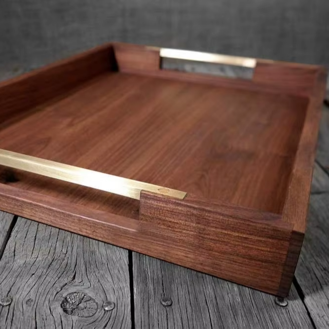 ถาดไม้ทำมือพร้อมขาโลหะ ถาดไม้ตกแต่งสำหรับใช้ในบ้านและโรงแรม จากซัพพลายเออร์อินเดีย ขายส่ง