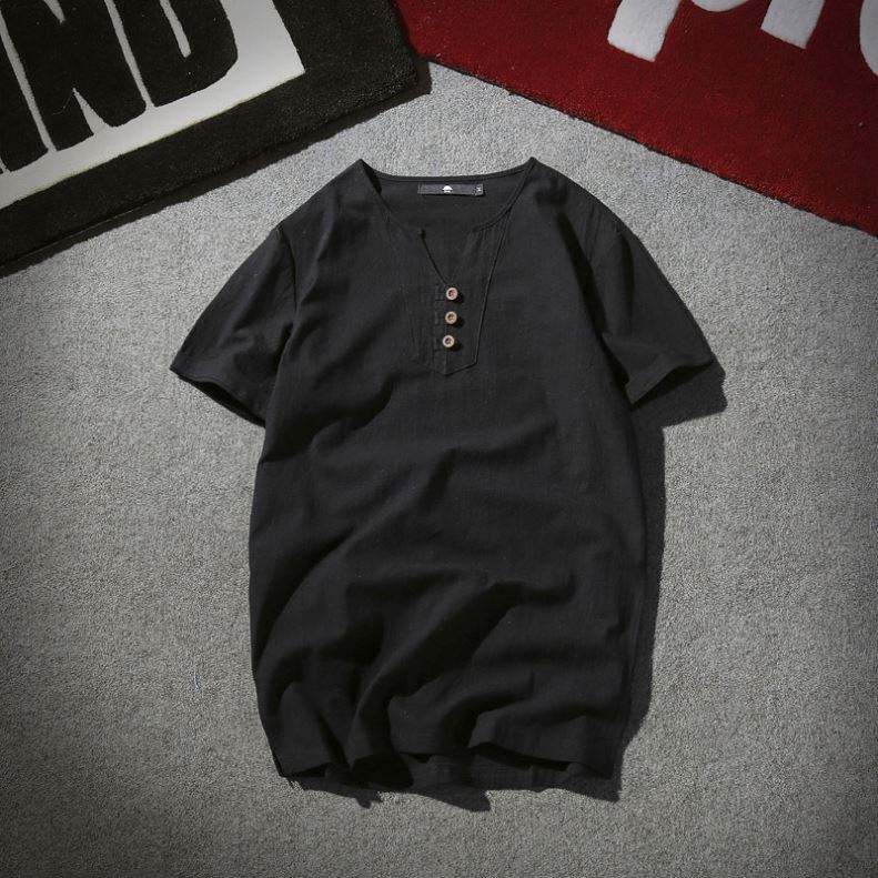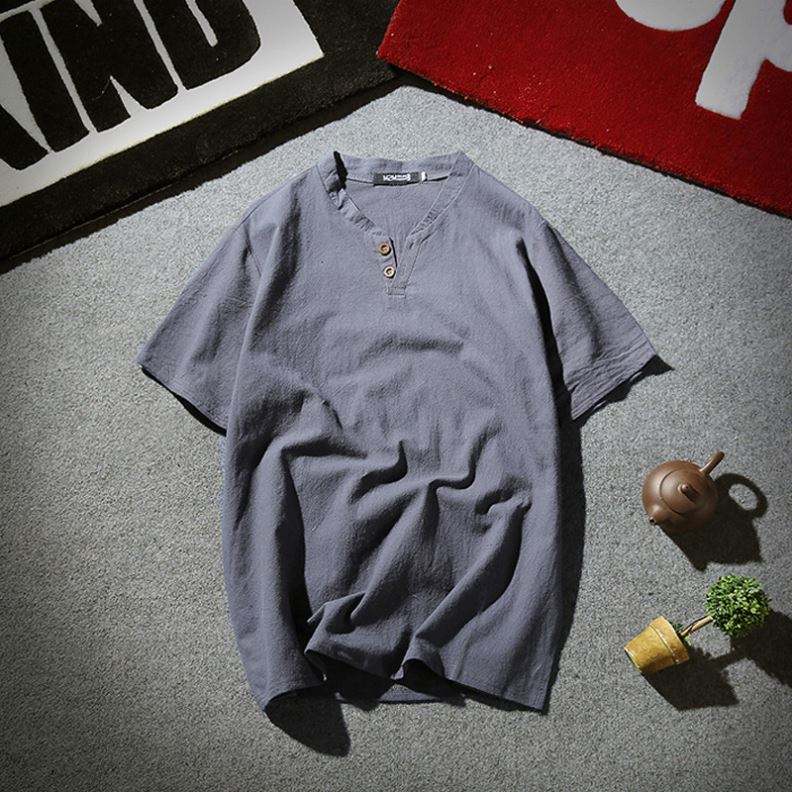 เสื้อผู้ชายคอวีทรงหลวม ระบายอากาศได้ดี ผ้าลินิน/คอตตอนถัก สีพื้น เรียบง่าย ยั่งยืน ขายส่ง พร้อมกระดุมแบบจีน