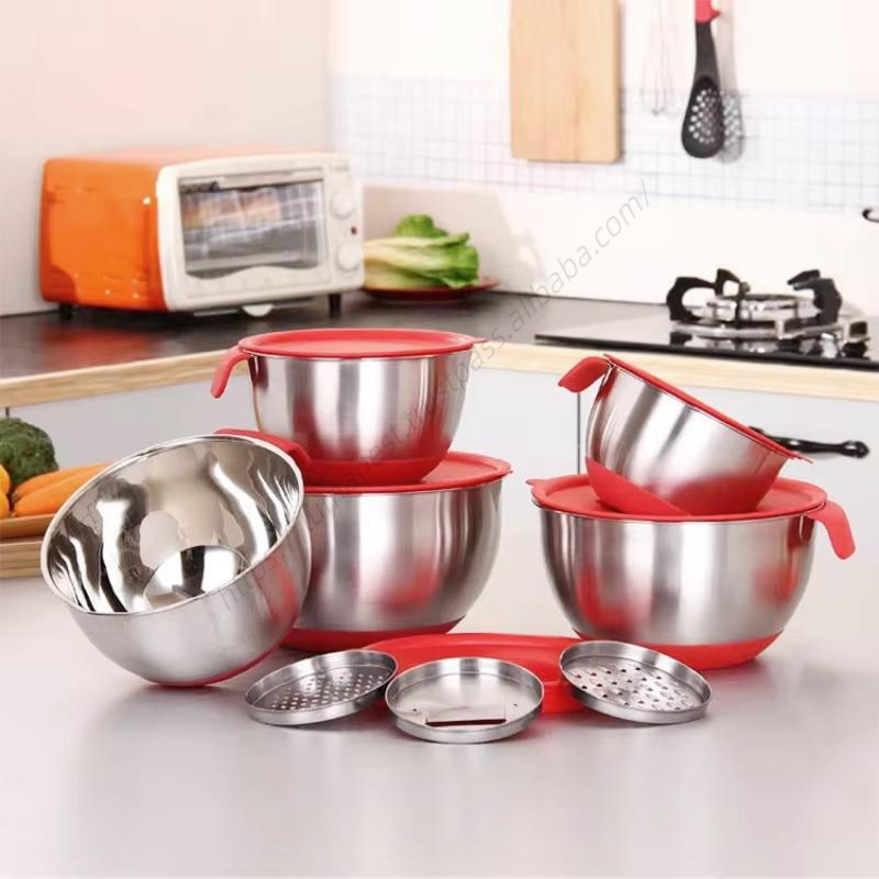 ชุดชามผสมสแตนเลสกันลื่น Syh609 พร้อมฝาปิด สำหรับสลัด ขายส่ง ภาชนะโลหะแบบใช้แล้วทิ้ง