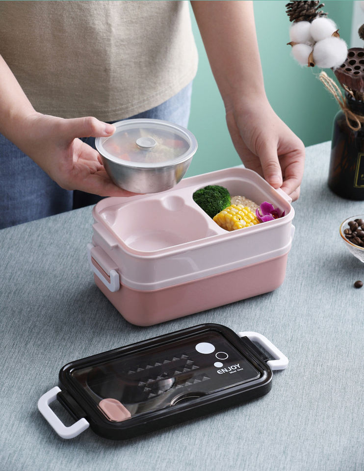 กล่องข้าวสแตนเลสและพลาสติกสองชั้น Syh700 สำหรับผู้ใหญ่และเด็ก บรรจุภัณฑ์สำหรับเก็บอาหาร ขายส่ง