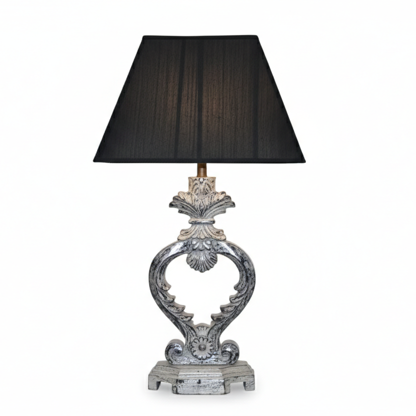 โคมไฟตั้งโต๊ะขายส่งพร้อมกรอบตกแต่งประณีตด้วยมือ ลวดลายแกะสลักอย่างสวยงาม และโคมทรงกรวยสีดำ สำหรับโรงแรมและบ้าน