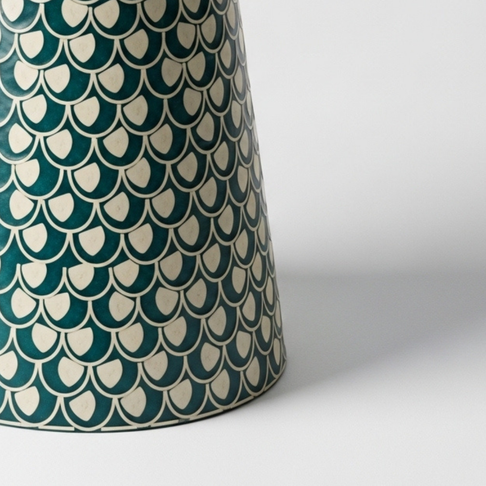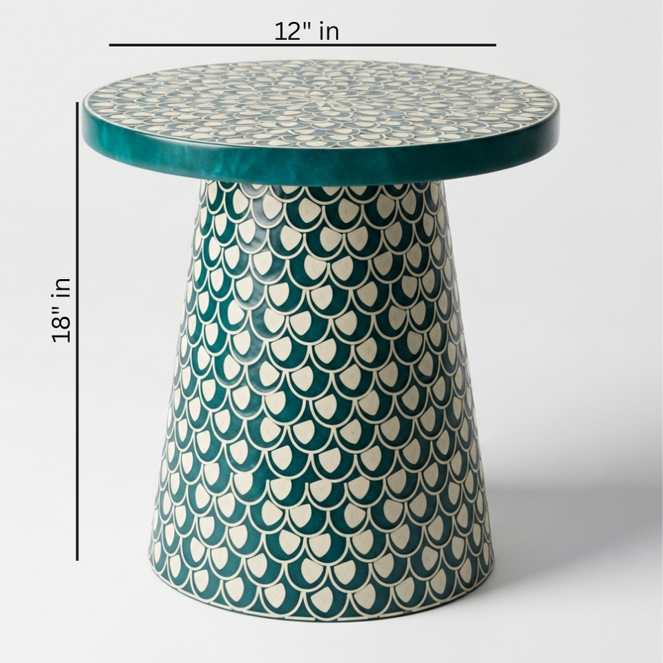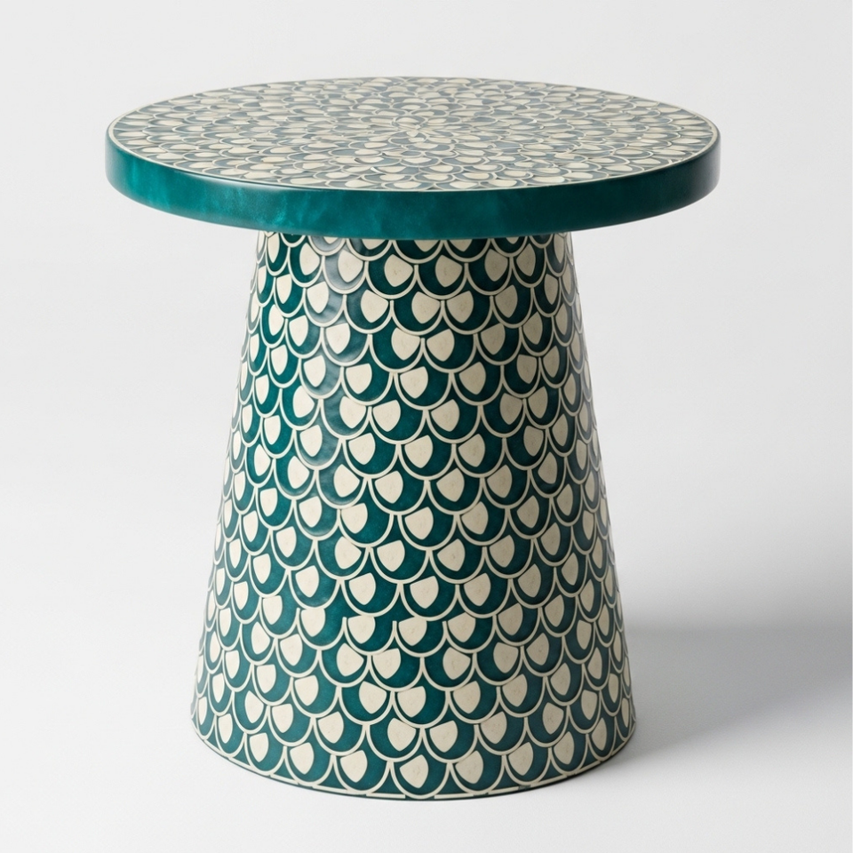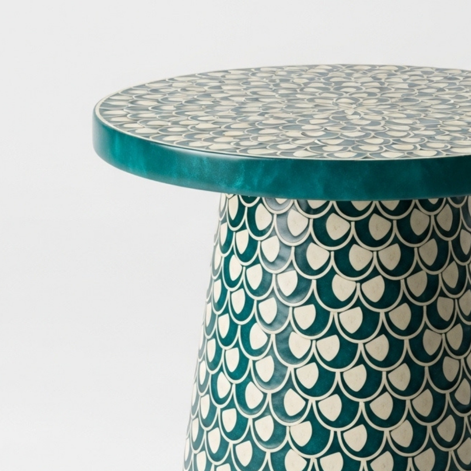 โต๊ะข้างทรงกลมสีเขียวอมฟ้าลายกระดูกปลาฝังมุก งานแฮนด์เมด โต๊ะกาแฟลายเกล็ดปลา
