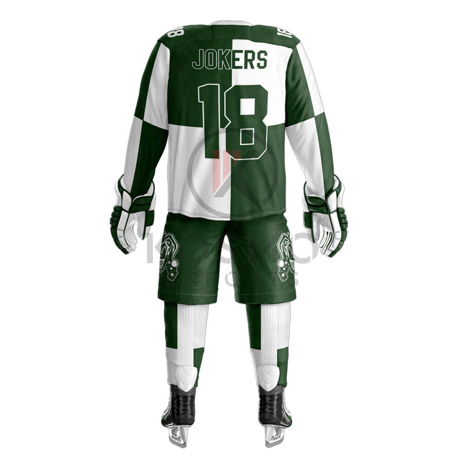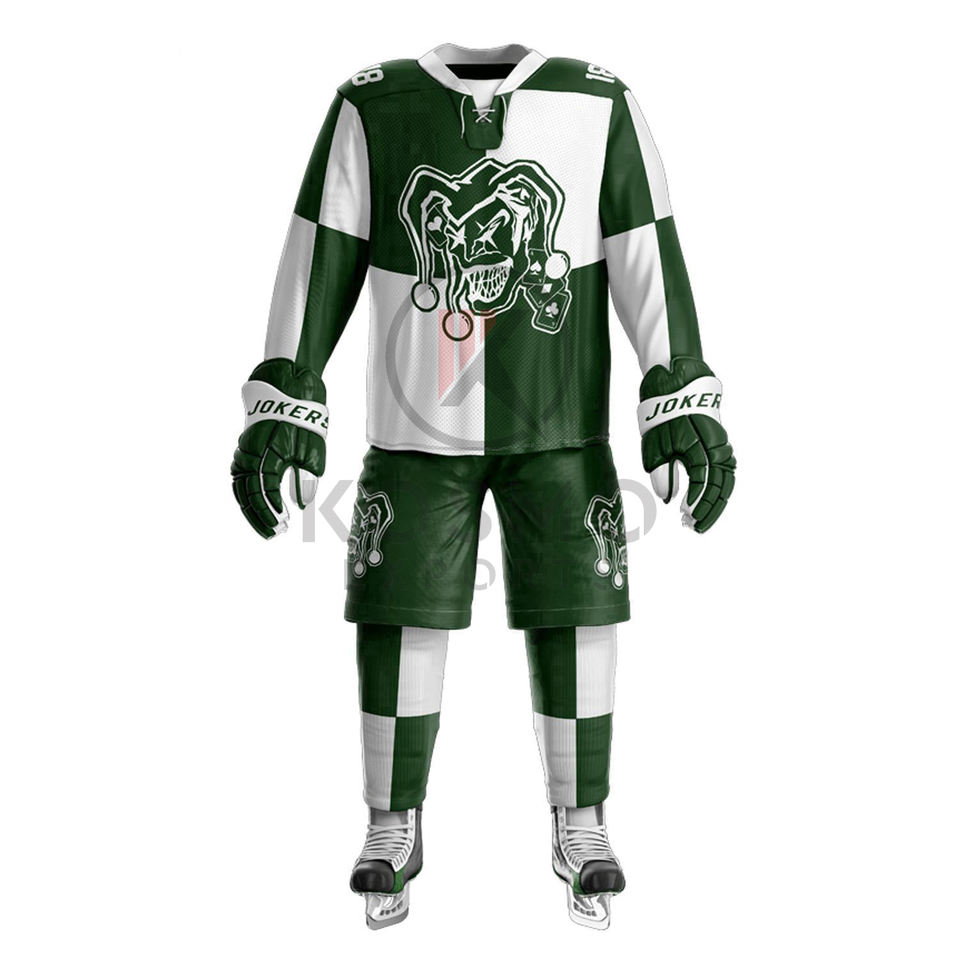 ชุดฮอกกี้น้ำแข็งแบบสั่งทำพิเศษ พิมพ์ลายด้วยเทคนิคซับลิเมชั่น พร้อมหมายเลขและโลโก้ ชุดยูนิฟอร์มฮอกกี้น้ำแข็งสำหรับเยาวชน รับผลิตแบบ OEM ดีไซน์เฉพาะตัว