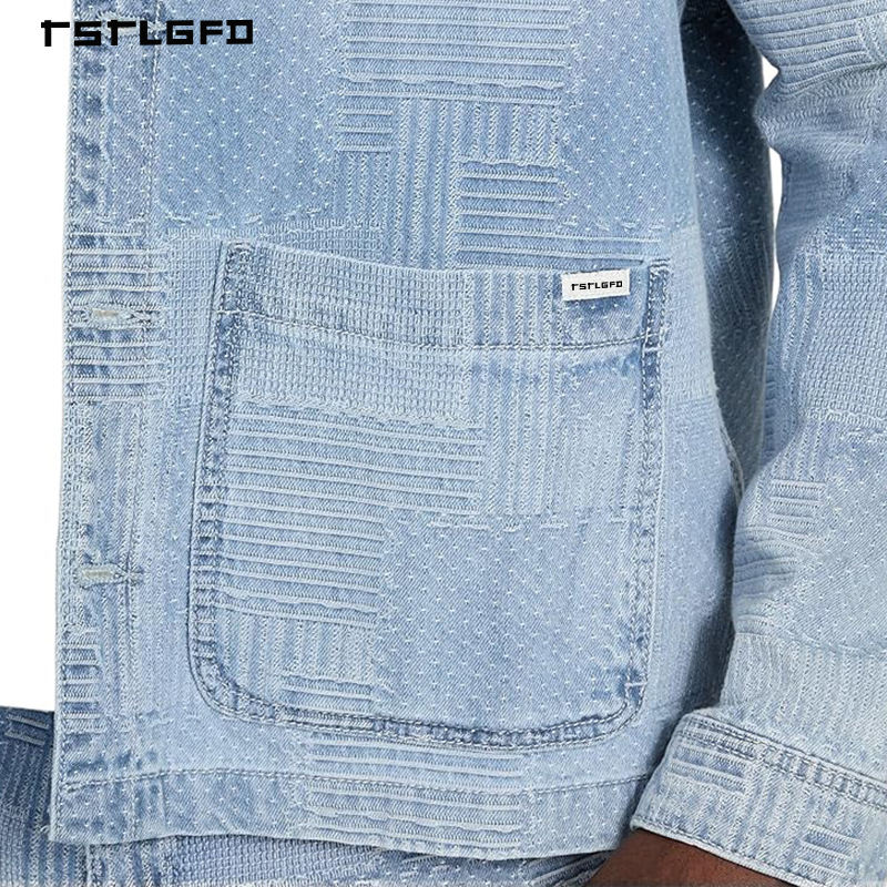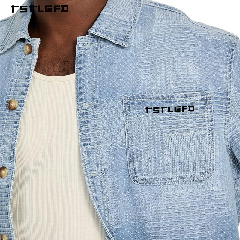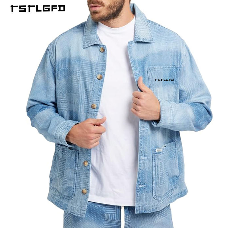 ชุดเซ็ตเสื้อแจ็คเก็ตยีนส์ติดกระดุมและกางเกงขาสั้นเดนิมลายปะติดสไตล์ซาชิโกสำหรับผู้ชาย แบรนด์สตรีทแวร์ ขายส่ง