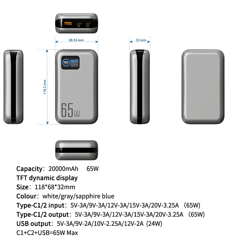 แบตสำรองขายส่งคุณภาพสูง ความจุเยอะ รองรับ OEM PD 65W ชาร์จเร็ว หน้าจอ TFT แบตสำรอง Proda 20000mah