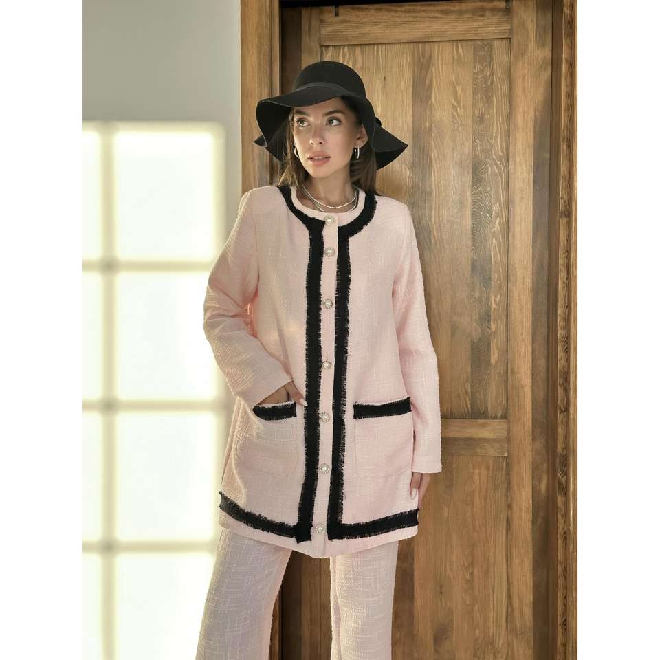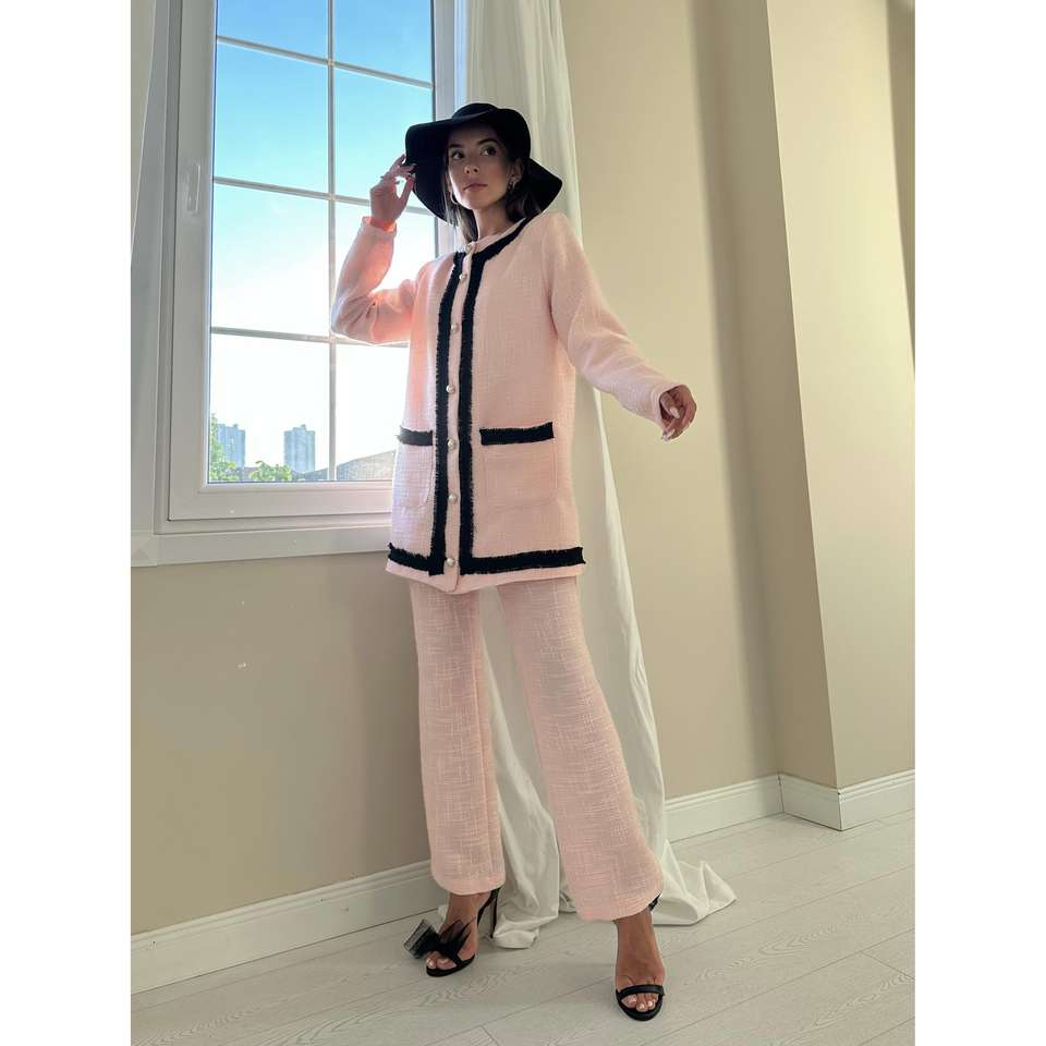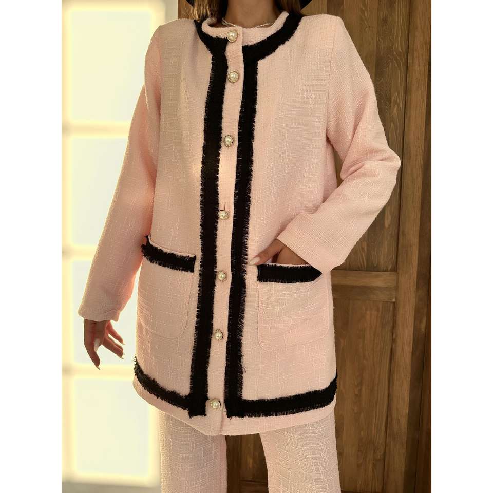 ชุดแจ็คเก็ตและกางเกงลายทางสีชมพูและสีดำแบบไม่มีปก ขายส่ง