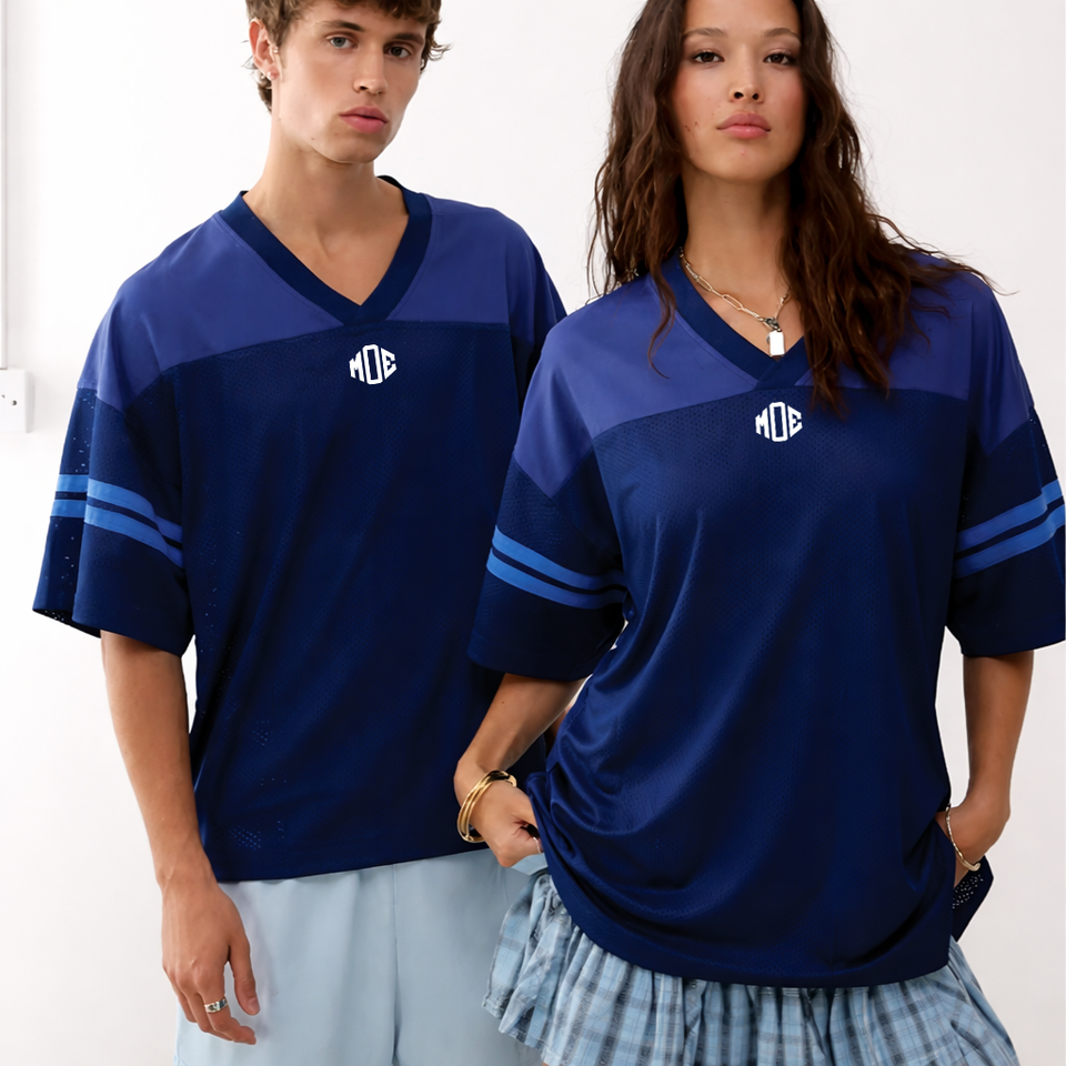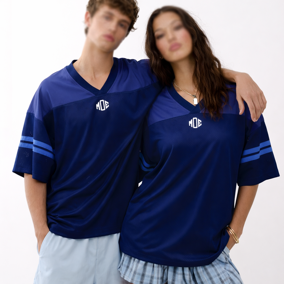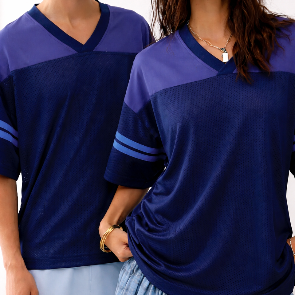 เสื้อฟุตบอลอเมริกันสีน้ำเงินกรมท่า คอวี แขนสั้น ผ้าตาข่าย สำหรับทีม ขายส่ง รับผลิตตามแบบ โลโก้สั่งทำได้ ผลิตจำนวนมาก