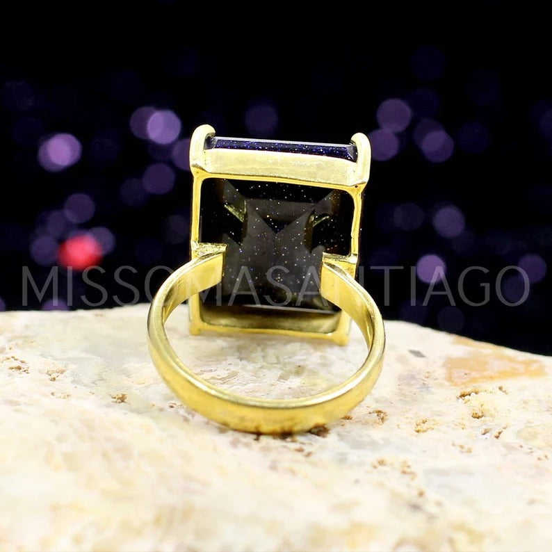 แหวนทำมือหินซันสโตนสีน้ำเงินสำหรับทุกเพศ ชุบทอง เครื่องประดับคุณภาพสูง ทรงมาร์คีส์ หินธรรมชาติขนาด 13x9 มม. น้ำหนัก 5.42 กรัม ดีไซน์แหวนผู้ชาย ขายส่ง