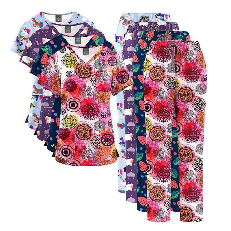 เสื้อสครับพิมพ์ลายเสื้อคอวีสำหรับแพทย์พยาบาลแขนสั้นระบายอากาศได้ดี