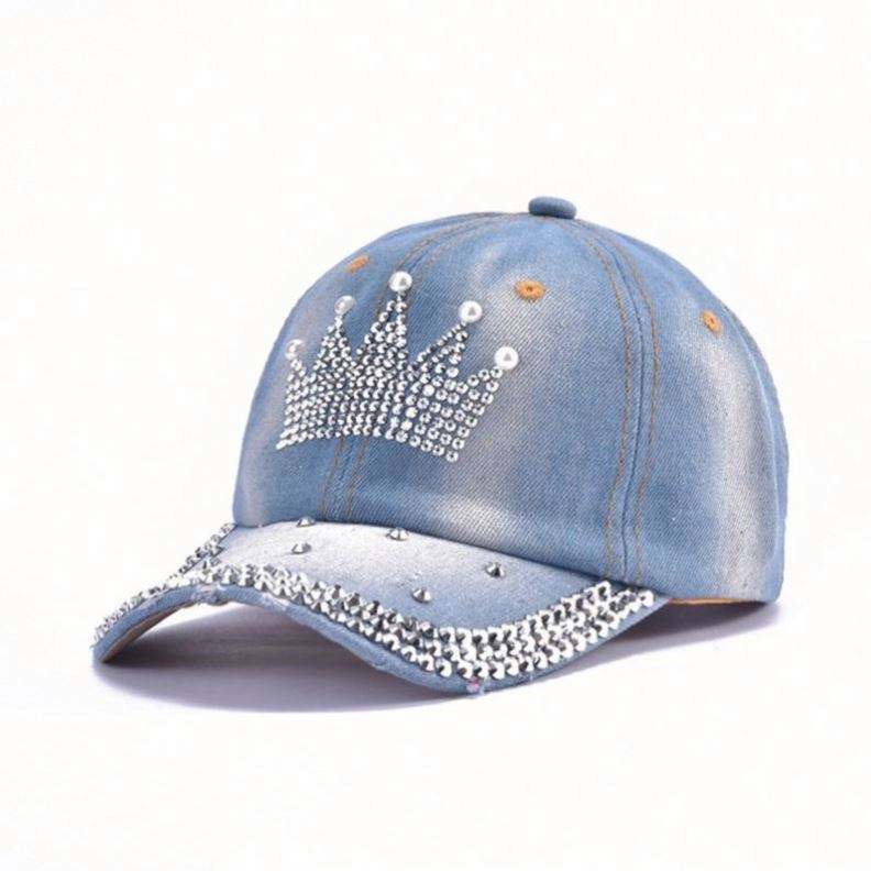 หมวกเบสบอลแบบ 6 แผง ผ้าเดนิมยูนิเซ็กซ์ ขายส่ง พร้อมตกแต่งด้วยคริสตัลและหัวเข็มขัดโลหะ