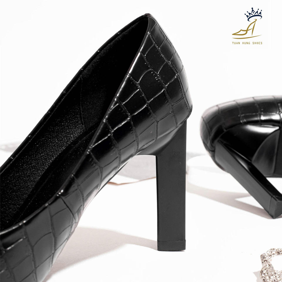 รองเท้าส้นสูงหัวแหลมแบบเวียดนามขายส่ง ส้นสูง 9 ซม. หนัง PU ลายจระเข้แบบด้าน รองเท้าผู้หญิง ODM