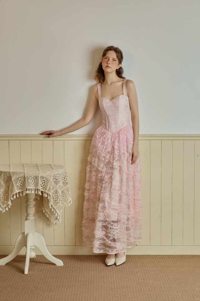 เดรสลำลองขายส่งจากเวียดนาม แขนกุด คอเหลี่ยม ยาวแบบแม็กซี่ รุ่น Hellen ผ้าลูกไม้ลายดอกไม้ 3 มิติ แบบสวม รุ่น Kd46 พร้อมจำหน่าย