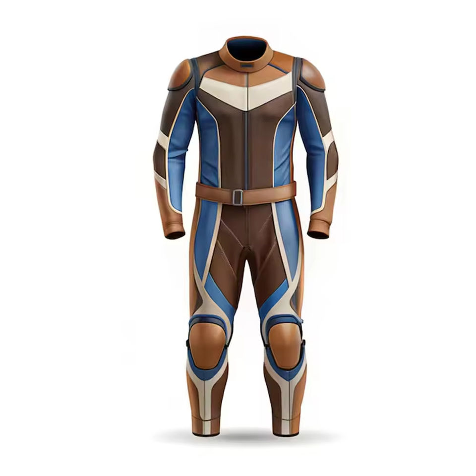 ชุดหนังสำหรับขี่มอเตอร์ไซค์แบบวินเทจสีน้ำตาล-น้ำเงิน ขายส่ง แบบชิ้นเดียว พร้อมเกราะป้องกันมาตรฐาน CE สไตล์เรโทร สำหรับผู้ชายและผู้หญิง