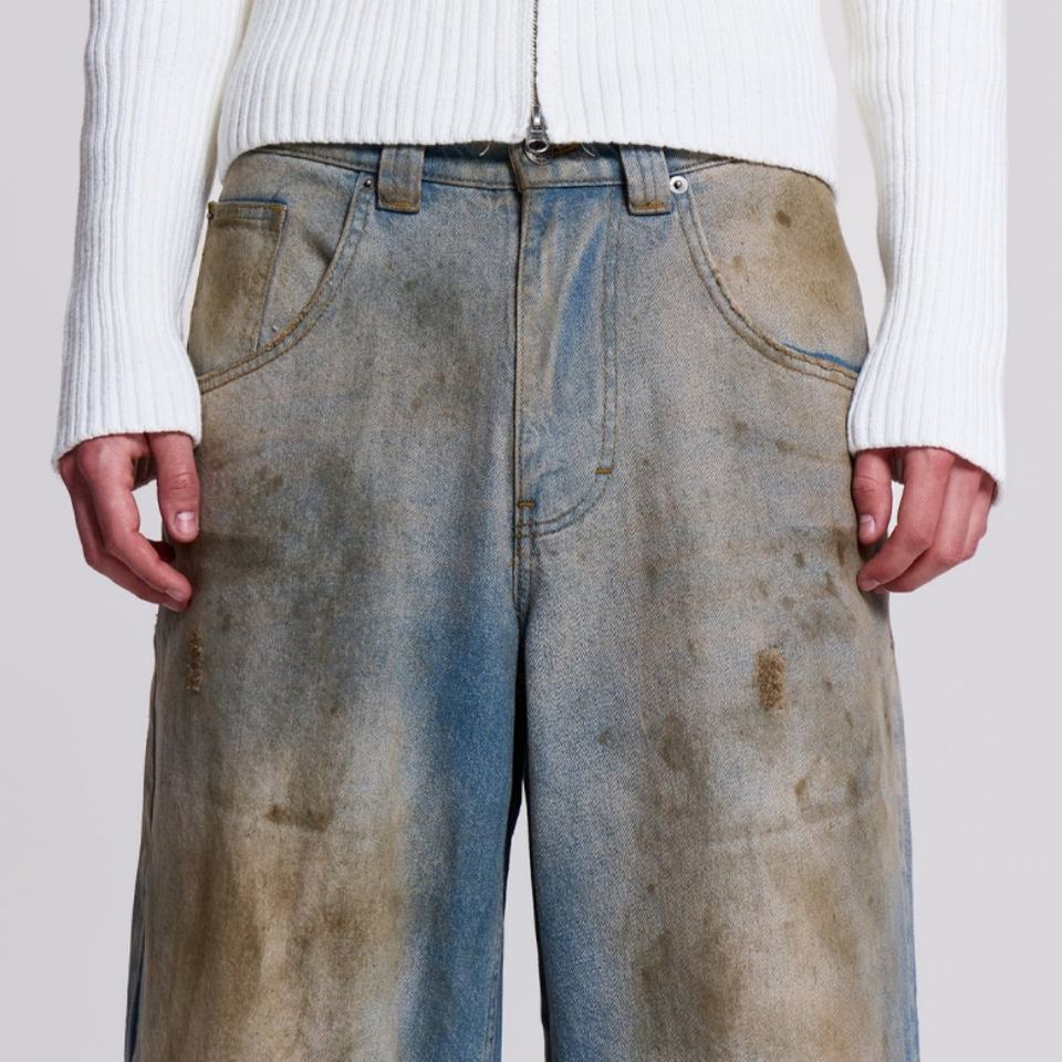 กางเกงยีนส์เดนิมหนาน้ำหนักมากคุณภาพสูงสไตล์วินเทจสั่งทำโลโก้ได้ ล้างสีแบบมัดวอช ขอบขาดๆ ทรงแบ็กกี้สำหรับผู้ชาย ขายส่ง