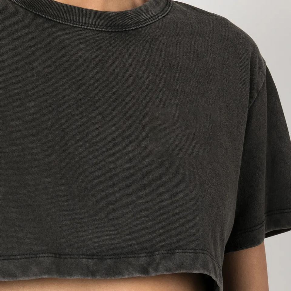 เสื้อครอปท็อปผู้หญิงสไตล์วินเทจสั่งทำโลโก้ได้ ขายส่ง เสื้อยืดครอปทรงสั้นซักย้อมสีเอซิดสำหรับฤดูร้อน คุณภาพสูง